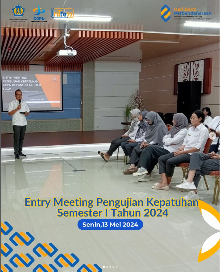 Pada Hari Senin, 13 Mei 2024, KPPN Kupang melaksanakan Entry Meeting Uji Kepatuhan yang dihadiri oleh Manajemen Puncak dan seluruh Pegawai KPPN Kupang sesuai Nota Dinas Kepala KPPN Nomor ND-408/KPN.2401/2024.
