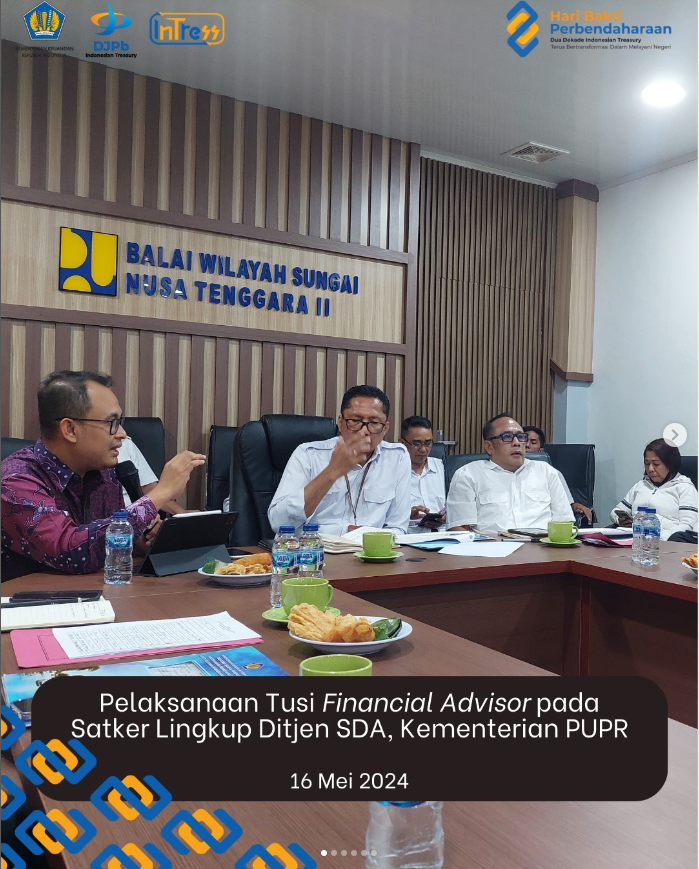 Monev Financial Advisor kali ini dilaksanakan secara luring bersama beberapa Satker Ditjen Sumber Daya Air (SDA) yaitu Balai Wilayah Sungai Nusa Tenggara II, SNVT Pelaksanaan Jaringan Pemanfaatan Air Nusa Tenggara II, SNVT Air Tanah dan Air Baku Nusa Tenggara II, SNVT Pembangunan Bendungan I Nusa Tenggara II, SNVT Pembangunan Bendungan II Nusa Tenggara II, SNVT Pelaksanaan Jaringan Sumber Air Nusa Tenggara II, Operasi dan Pemeliharaan Sumber Daya Air Nusa Tenggara II.