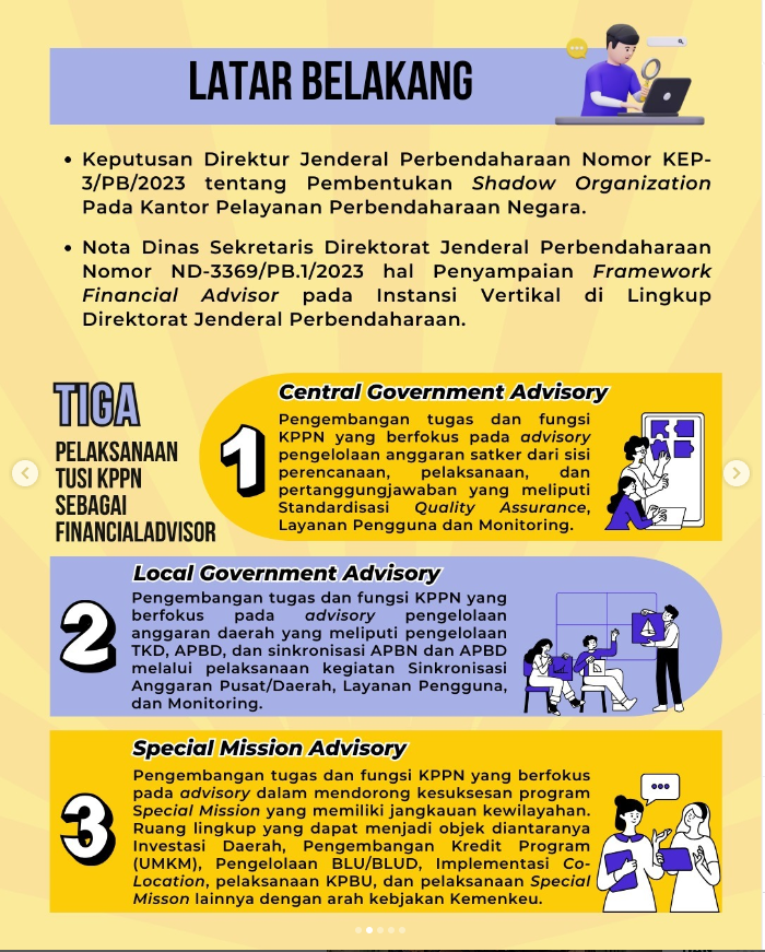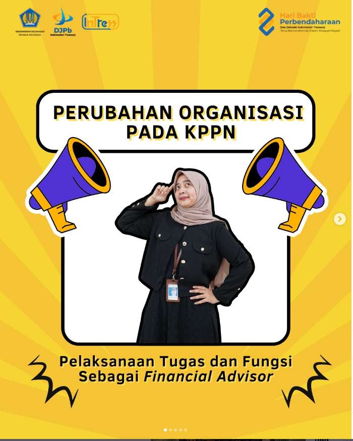 Kantor Pelayanan Perbendaharaan Negara memiliki tugas dan fungsi sebagai Financial Advisor yang terdiri dari Central Gorvernment Advisory, Local Governmenr Advisory, dan Special Mission Advisory.