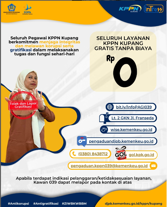 Berkenaan dengan momen Hari Raya Idul Adha, kembali kami sampaikan #kawan039 (mitra kerja/pihak eksternal KPPN Kupang) agar tidak memberikan gratifikasi kepada pejabat/pegawai KPPN Kupang. Berikut saluran pengaduan untuk melaporkan gratifikasi pada KPPN Kupang.
