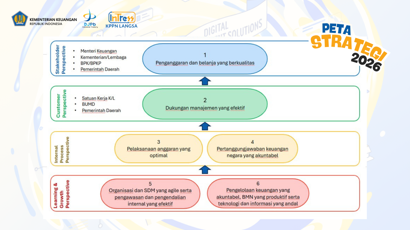 Berdasarkan Keputusan Menteri Keuangan Republik Indonesia Nomor KMK-300/KMK.01/2022 Peta Strategi merupakan suatu dashboard yang memetakan Sasaran Strategis (SS) dalam suatu kerangka hubungan sebab akibat yang menggambarkan keseluruhan perjalanan strategi organisasi dalam mewujudkan visi dan misi. Peta strategi merupakan media yang dapat memudahkan dalam mengomunikasikan strategi organisasi. Untuk mencapai tujuan organisasi, Kepala KPPN Langsa selaku Pemilik Peta Strategi memiliki Peta Strategi yang dapat digambarkan sebagai berikut.
