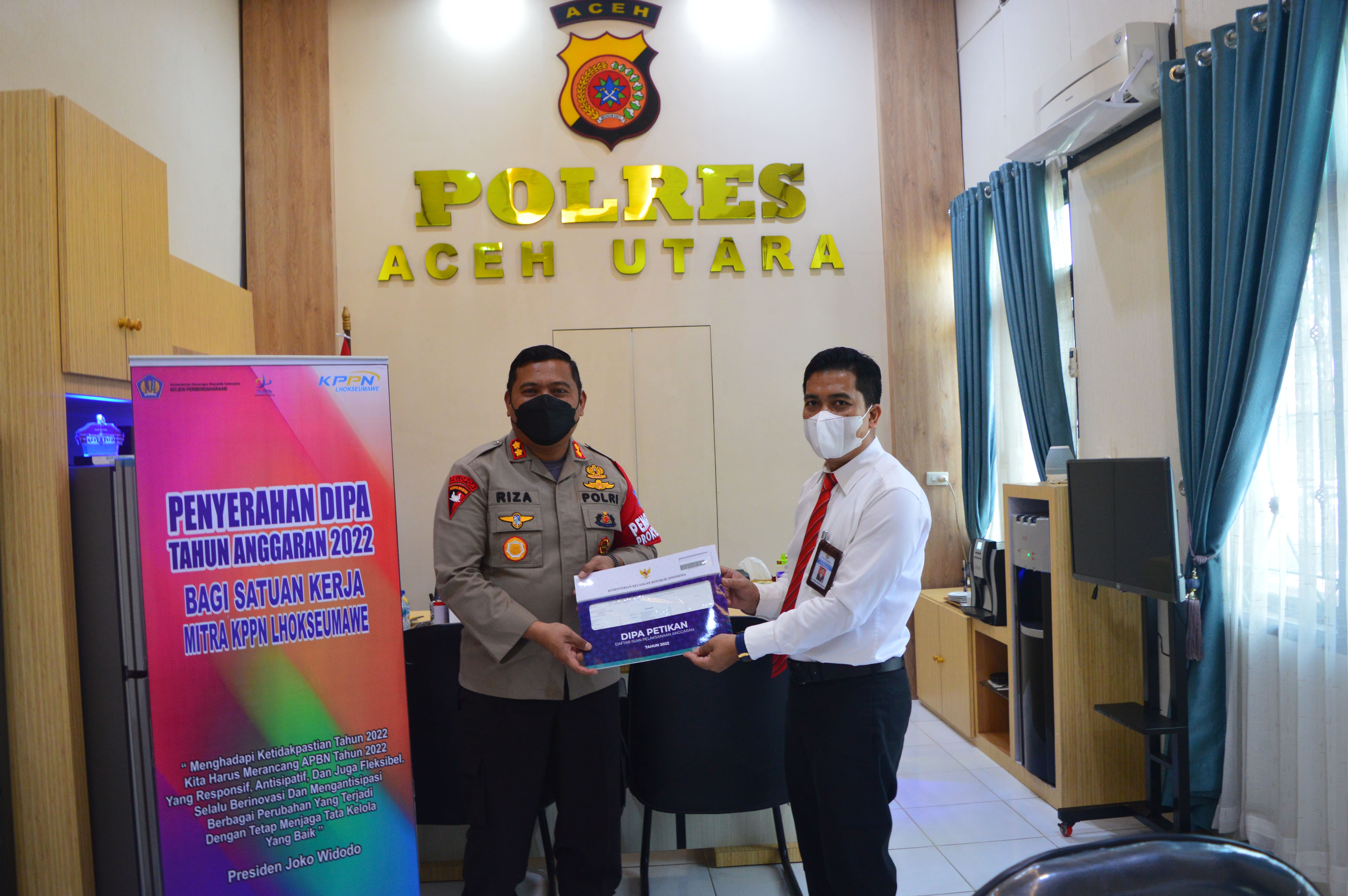 Dengan tetap mematuhi protokol kesehatan, Kepala KPPN Lhokseumawe Bapak Semfebri Marihot Simbolon menyerahkan DIPA Petikan TA.2022 secara langsung kepada Kuasa Pengguna Anggaran Satker yang memiliki Pagu DIPA besar, penyerahan dilakukan secara simbolis kepada 6 (enam) satuan kerja dari 100 satuan kerja mitra kerja KPPN Lhokseumawe. Adapun satuan kerja tersebut adalah IAIN Lhokseumawe, KPP Pratama Lhokseumawe, KP BC Lhokseumawe, Kementerian Agama Kabupaten Aceh Utara, POLRES Lhokseumawe, dan POLRES Aceh Utara. Untuk satuan-satuan kerja lainnya penyerahan dilakukan secara terpisah dan/atau drive thru. Hal ini dilakukan untuk menghindari kerumunan dalam rangka pencegahan penularan Covid-19.