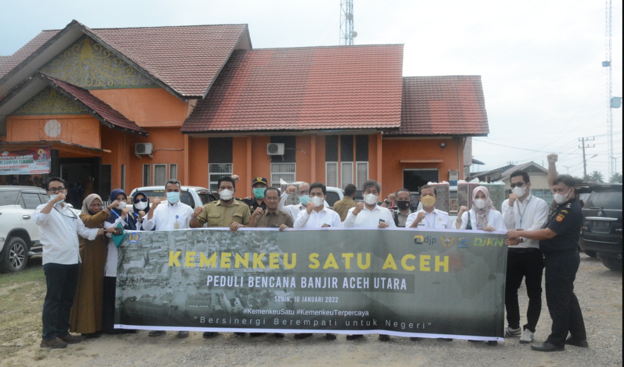 Perwakilan Kementerian Keuangan Aceh Satu Bersama RRI Peduli menyalurkan bantuan kepada korban banjir Aceh Utara pada hari Senin, 10 Januari 2022. Rombongan Kementerian Keuangan Satu Aceh diketuai oleh Kepala Kantor Pelayanan Kekayaan Negara dan Lelang (KPKNL) Lhokseumawe, Bono Yudianto didampingi Kepala Pelayanan Perbendaharaan Negara (KPPN) Lhokseumawe, Semfebri Marihot Simbolon , Kepala Kantor Bea Cukai diwakili Kasub Bagian Umum, Widhodho, Kepala Subbagian Umum Kantor Pelayanan Pajak (KPP) Pratama Lhokseumawe, Ludwi Winardi dan Kepala Stasiun RRI Lhokseumawe, Dadan Sutaryana.