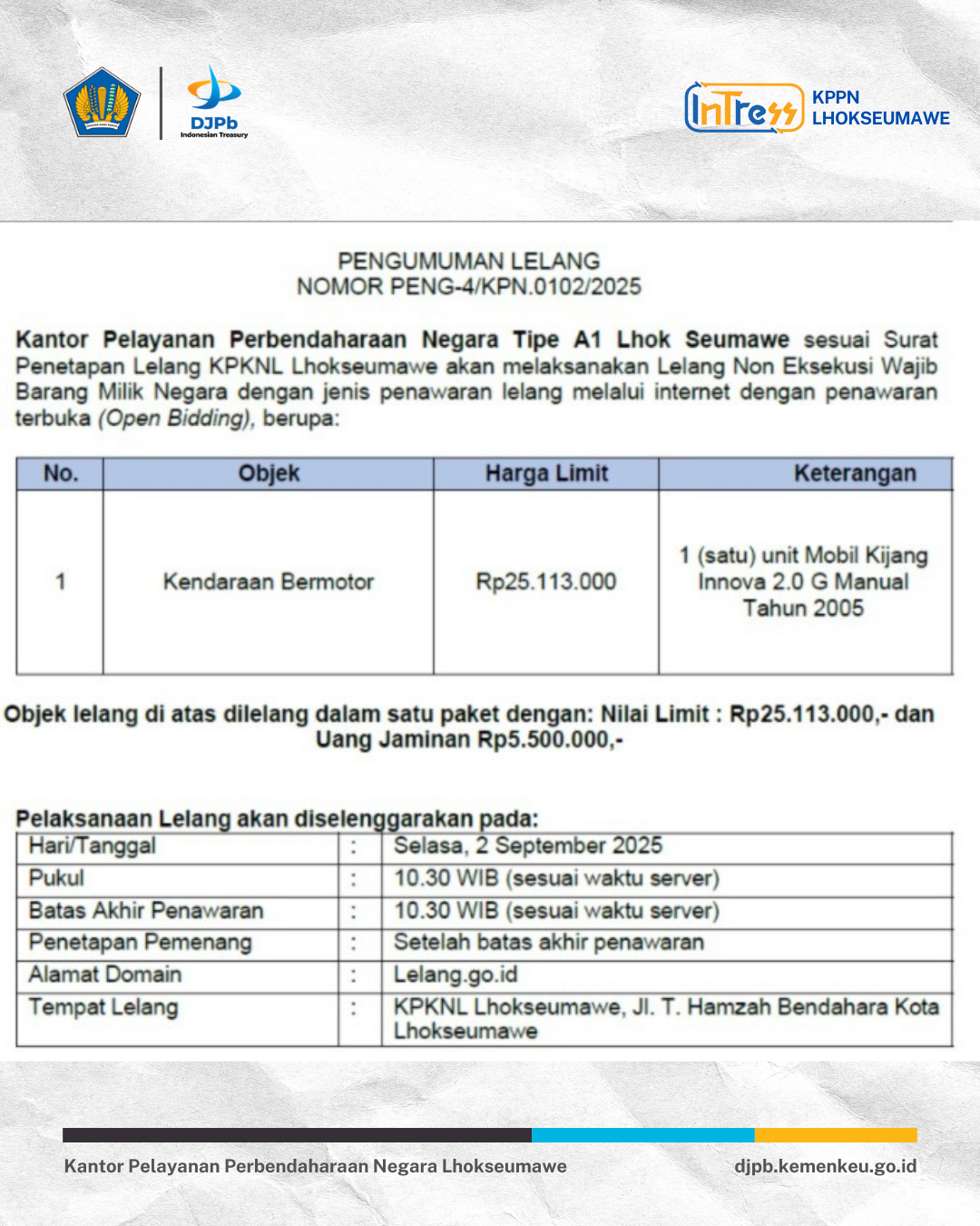 Pengumuman Lelang Kendaraan Bermotor pada KPPN Lhokseumawe