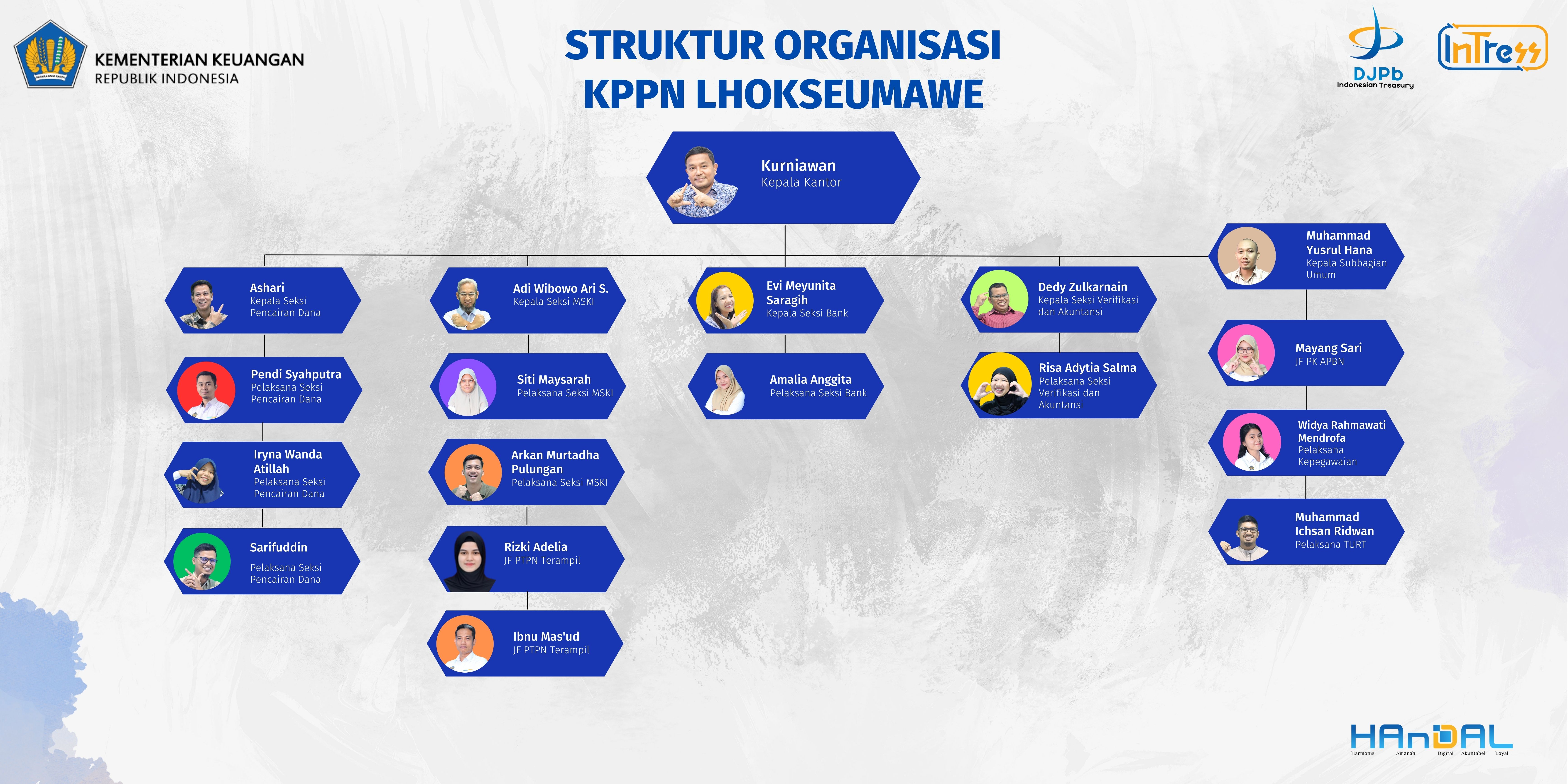 Sesuai dengan Peraturan Menteri Keuangan Republik Indonesia Nomor 262/PMK.01/2016 tentang Organisasi dan Tata Kerja Instansi Vertikal Direktorat Jenderal Perbendaharaan, KPPN Lhokseumawe sebagai KPPN Tipe A1 terdiri atas: