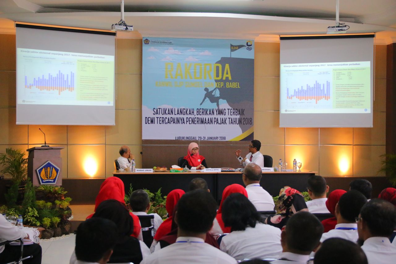 Acara Rakorda dihadiri oleh seluruh Kepala KPP se Sumatera Selatan dan Bangka Belitung, para pejabat eselon 3 dan 4, pejabat fungsional dan para AR.