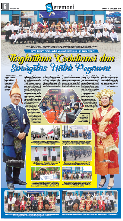 haraan Negara (KPPN) dan Kantor Pelayanan Pajak (KPP) Pratama Lubuk Linggau mengikuti upacara peringatan Hari Oeang Republik Indonesia (HORI) ke-73, sekaligus Hari Sumpah Pemuda ke-91, Rabu (30/10). Dan uniknya, tahun ini upacara digelar berbeda dari tahun-tahun sebelumnya, di mana lebih meriah dan lebih semarak. Karena beberapa pegawai Kementerian Keuangan (Kemenkeu) di Kota Lubuklinggau ada yang mengenakan pakaian adat Nusantara dari berbagai daerah, seperti Jawa, Kalimantan, Bali, Lubuklinggau, Maluku, Jawa Barat, Padang dan masih banyak lagi, yang mana dilakukan untuk memeriahkan Hari Sumpah Pemuda. Upacara HORI ke-73 tahun 2019 yang bertemakan Maju Bersama Menghadapi Tantangan ini, Kepala KPPN Lubuk Linggau Rosaldina menjadi pembina upacara, yang turut membacakan sambutan Menteri Keuangan RI Sri Mulyani Indrawati. Sebenarnya, rangkaian kegiatan kemeriahan HORI ke-73 telah mulai dilaksanakan pada Selasa (22/10) dengan aksi donor darah yang diikuti pegawai dan para Satuan Kerja (Satker) KPPN maupun KPP Pratama Lubuk Linggau, yang mana berhasil mengumpulkan 34 kantong darah. Kemudian dilanjutkan dengan kegiatan senam bersama dan olahraga bersama para pegawai internal Kementerian Keuangan, Jumat (25/10). Serta Selasa (29/10) kembali memberikan santunan kepada anak-anak yatim di Panti Asuhan Al Kautsar, di Jalan Raya Rahma RT.02 Nomor 099 Kelurahan Perumnas Rahma, Kota Lubuklinggau Selatan I, berupa uang santunan, sembako, bahan pokok makanan seharihari, nasi kotak dan beberapa keperluan panti berupa termos, magic jar besar, perlengkapan salat, tikar, ambal, serta makan siang untuk anak-anak di Panti Asuhan Al Kautsar. Saat diwawancarai Kepala KPP Pratama Lubuk Linggau, Ronny Johannes Purba mengatakan HORI tahun ini sama seperti tahun-tahun lalu, merasakan kegembiraan dan semangat yang tinggi apalagi menuju akhir tahun agar bisa menuntaskan tugas dan target. ”