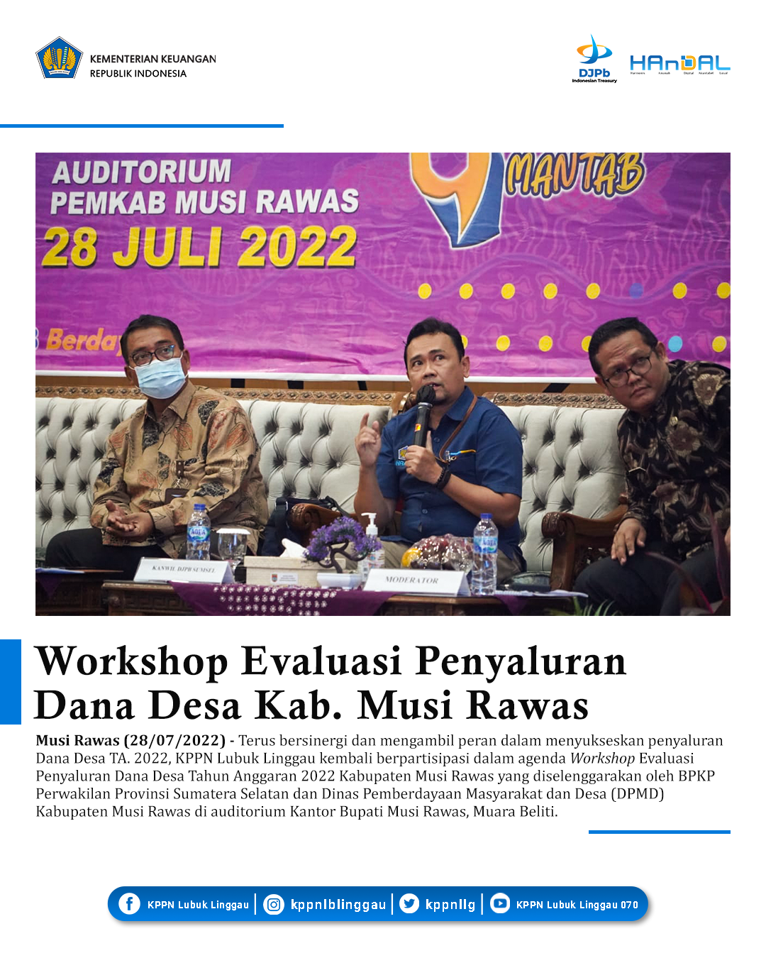 Terus bersinergi dan mengambil peran dalam mensukseskan Penyaluran Dana Desa TA. 2022, KPPN Lubuk Linggau kembali berpartisipasi dalam agenda Workshop Evaluasi Penyaluran Dana Desa TA. 2022 Kab. Musi Rawas.