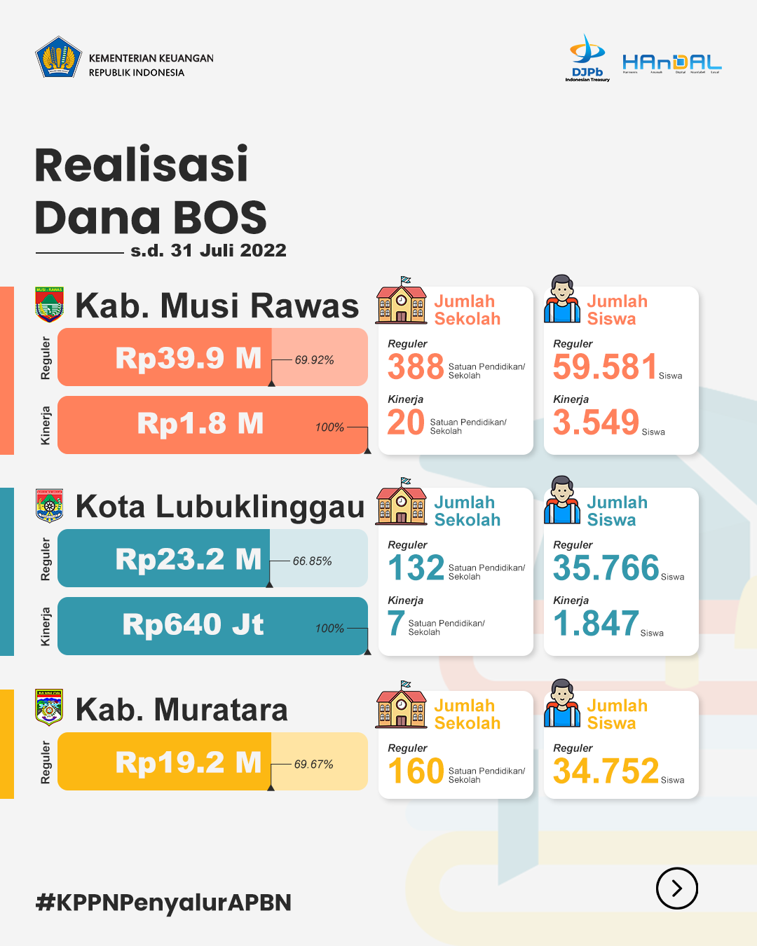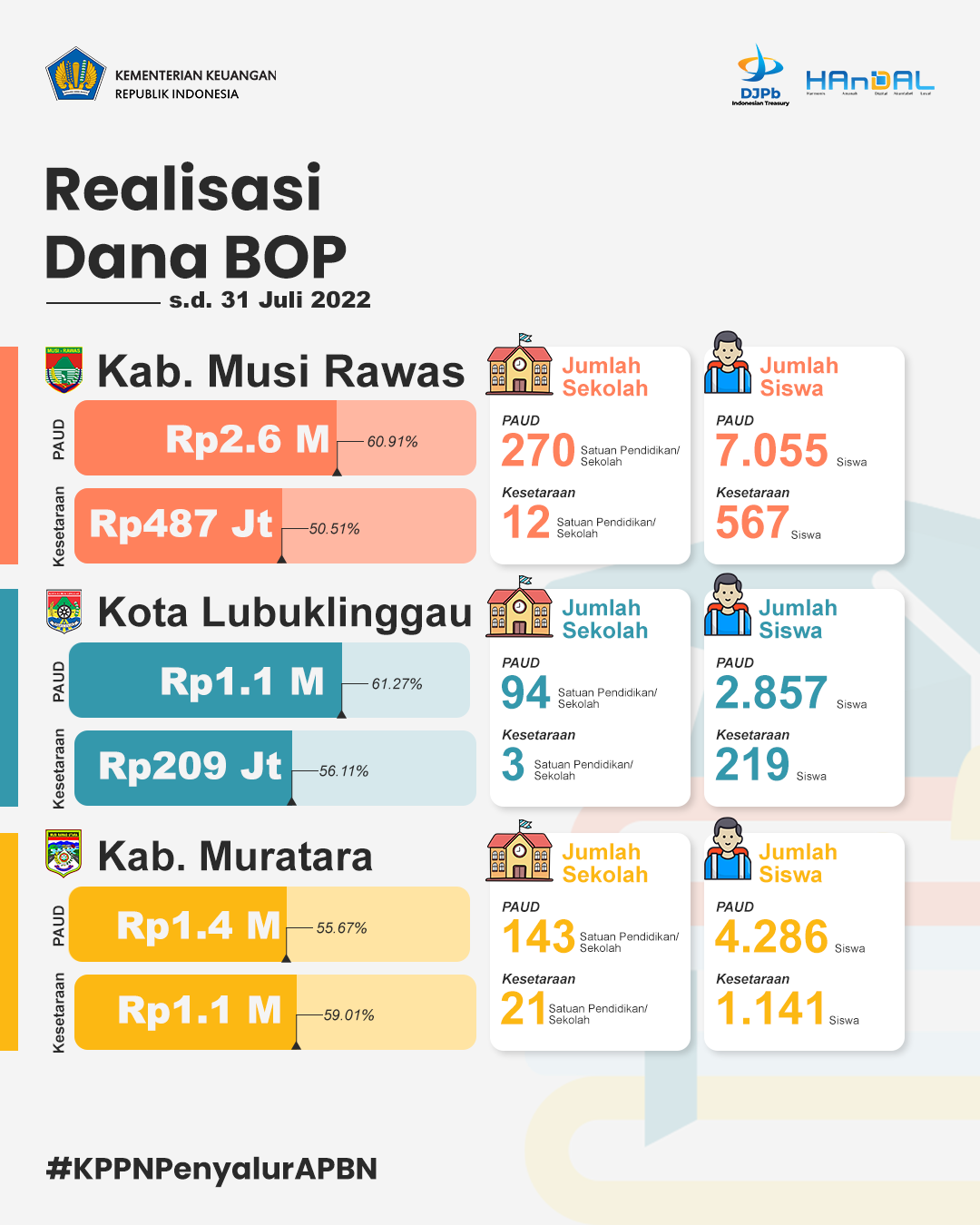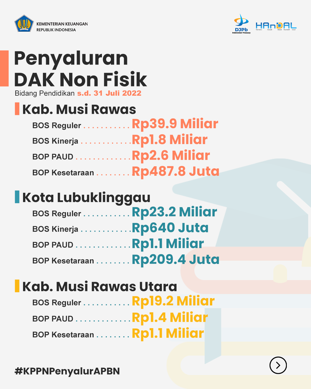 Harapannya dengan penyaluran DAK Non Fisik yang cepat dan tepat melalui KPPN Lubuk Linggau, dapat mendukung pemenuhan kebutuhan biaya penyelenggaraan pendidikan di Satuan Pendidikan/Sekolah penerima BOS/BOP guna meningkatkan kualitas pendidikan di wilayah Kota Lubuk Linggau, Kab. Musi Rawas, dan Kab. Musi Rawas Utara.