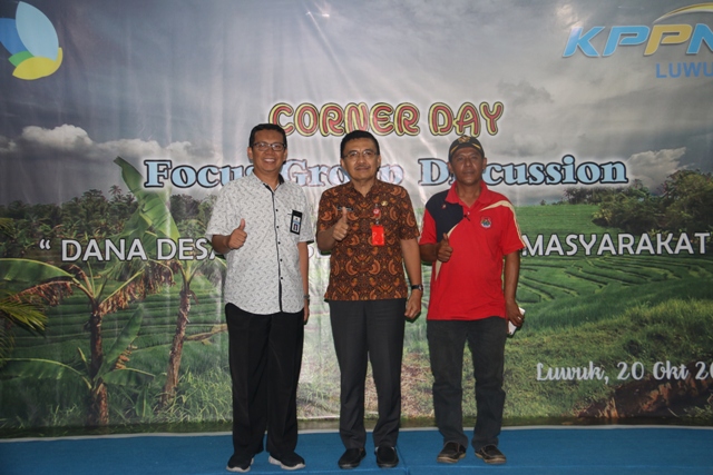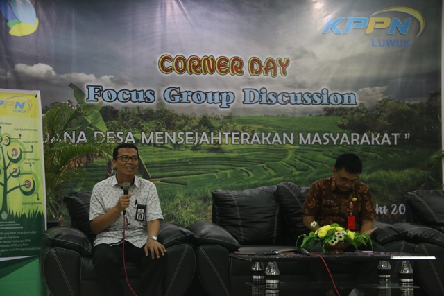 Kegiatan corner day kemudian dilanjutkan dengan Focus Group Discussion dengan tema "Dana Desa Mensejahterakan Masyarakat". Pemateri : Nurfatoni (Kepala KPPN Luwuk), Yusuf Bidin (Kepala BPMD Kab. Banggai), Idham Milang (Kepala Desa Bubung). "Dalam acara Corner Day ini diadakan FGD dengan tema "Dana Desa Mensejahterakan Masyarakat" sehingga kita bisa bersinergi dalam pengelolaan dana desa untuk percepatan pencairan dana desa. sehingga, apa yang kira harapakan bisa berjalan sesuai ketentuan" pungkas Nurfatoni, Kepala KPPN Luwuk dalam sambutannya mengawali kegiatan FGD.