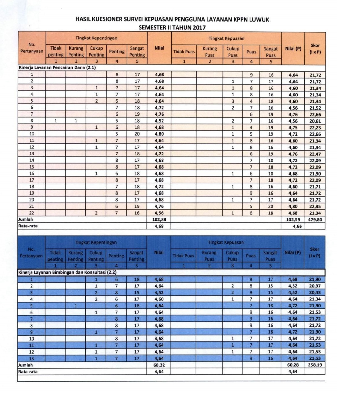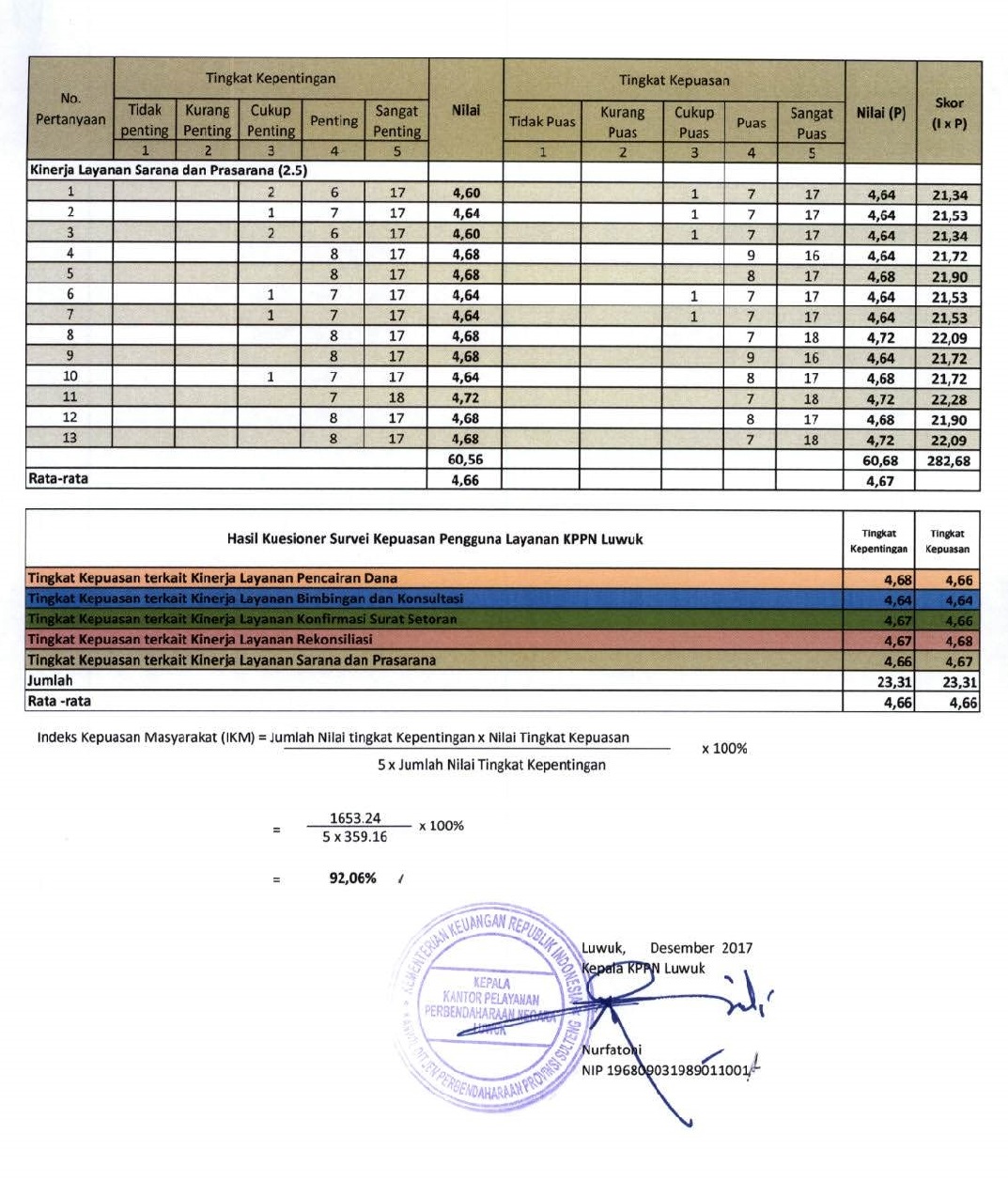 Terima kasih kepada seluruh mitra satker KPPN Luwuk, yang telah berpartisipasi aktif dalam pelaksanaan Kuesioner Kepuasan Pengguna Layanan atas layanan yang telah diberikan oleh KPPN Luwuk selama semester II tahun anggaran 2017. Survey dilaksanakan dengan membagikan kuesioner yang kontennya sesuai dengan ketentuan yang berlaku kepada Mitra Satker KPPN Luwuk secara acak dalam periode Juli - Desember 2017.