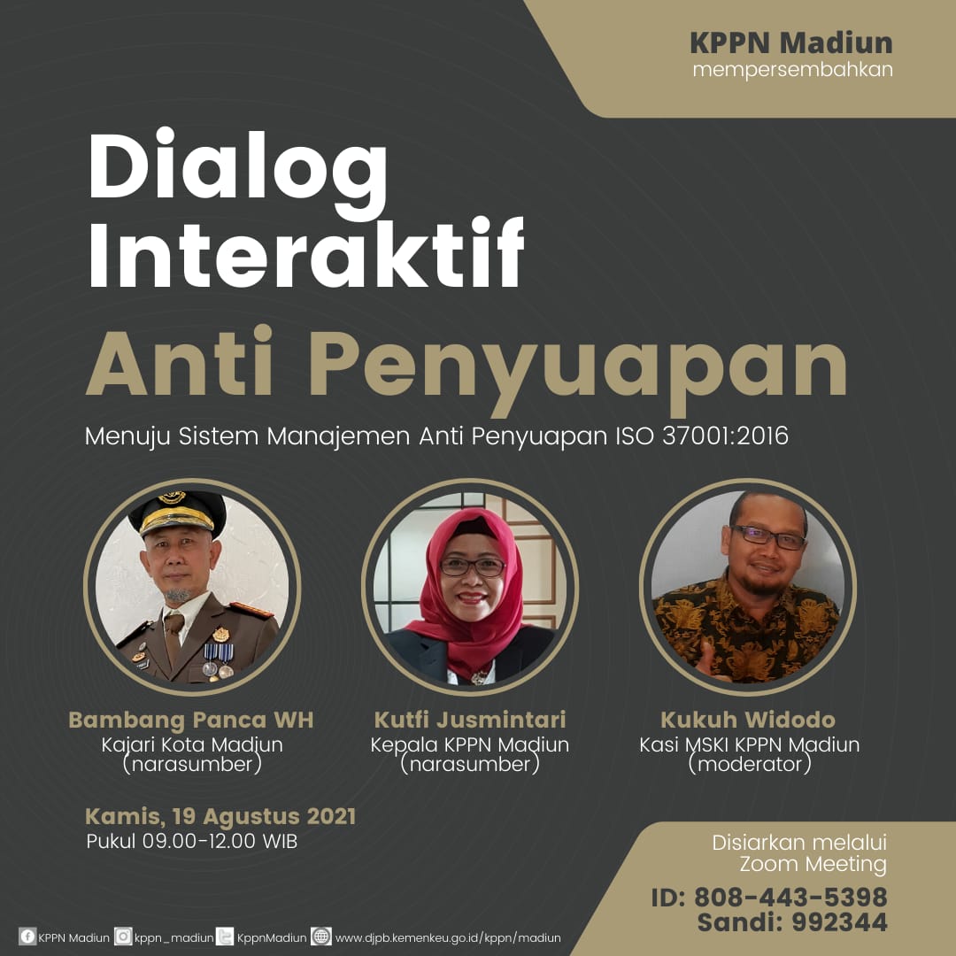 Bagi KPPN Madiun yang telah diberi kehormatan besar sebagai unit kerja Piloting dalam implementasi dan sertifikasi ISO 37001:2016, hal ini merupakan tanggungjawab besar dan kesempatan pembuktian bahwa KPPN (Dirjen Perbendaharaan) adalah institusi yang secara nyata menjadikan penyuapan sebagai musuh utama yang harus kita lawan. Mewujudkan organisasi yang bersih dan berintegritas adalah menjadi harga mati harus kita penuhi, untuk mewujudkan Indonesia yang lebih baik.