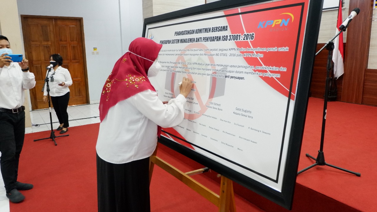 Bertempat di Aula KPPN Madiun, Senin 26 Juli 2021 telah dilaksanakan kegiatan Internalisasi dan Penandatanganan Komitmen Penerapan Sistem Manajemen Anti Penyuapan ISO 37001: 2016 oleh seluruh Pegawai KPPN Madiun. Kegiatan tersebut merupakan rangkaian kegiatan yang dilakukan dalam rangka implementasi penerapan Sistem Manajemen Anti Penyuapan ISO 37001:2016 pada KPPN Madiun, sebagaimana diamanatkan oleh Ditjen Perbendaharaan dengan ND-2853/PB.1/2021 tanggal 20 Juli 2021 hal Penetapan KPPN Madiun Sebagai Unit Kerja Piloting Implementasi dan Sertifikasi Sistem Manajemen Anti Penyuapan (SMAP) ISO 37001:2016 Lingkup DJPb Tahun 2021.