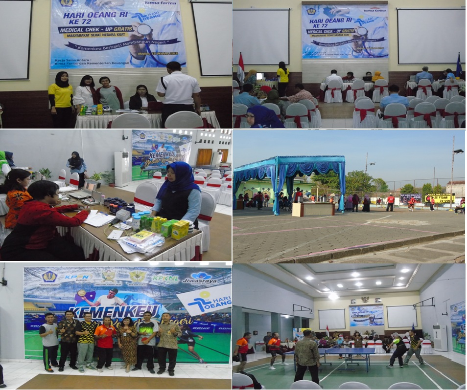 Dalam rangka memperingati Hari Oeang RI ke-72, Kantor Vertikal Kemenkeu se Madiun Raya yang terdiri dari KPPN Madiun, KPP Pratama Madiun, Ponogoro, Ngawi , KPKNL Madiun, Asuransi Jiwa raya Madiun mengadakan berbagai pertandingan olah raga seperti Bola Voly, Tenis Meja dan kegiatan Bakti Sosial berupa pemeriksaan gratis bekerja sama dengan PT Kimia Farma. Upacara Pembukaan dilaksanakan pada hari Jumat tgl 6 Oktober 2018 bertempat di halaman KPP Pratama Madiun yang diikuti seluruh kontingen dibuka oleh Kepala KPKNL Madiun Bpk Adi. Dalam sambutannya bahwa kegiatan ini bertujuan selain untuk memeriahkan Hari Oeang ke-72 juga untuk membangun kebersamaan dan kesatuan dan meningkatkan kesehatan dan kebugaran pegawai agar dapat melaksanakan tugas dan tanggung jawabnya dengan baik.