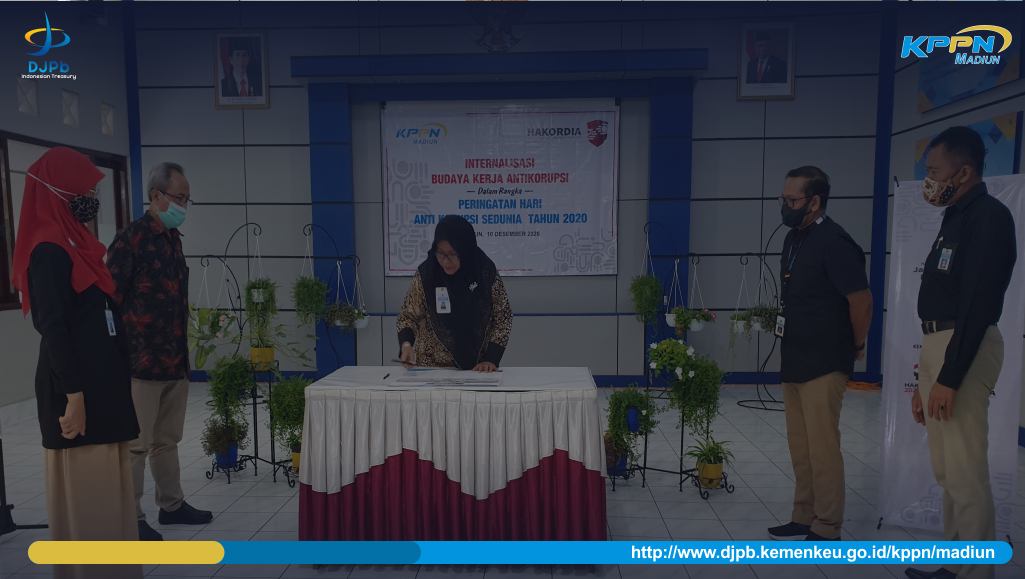 KPPN Madiun senantiasa berkomitmen untuk menjunjung tinggi integritas dalam memberikan pelayanan kepada stakeholders. Integritas merupakan modal dasar untuk mewudkan pelayanan publik yang bersih, profesional, dan akuntabel. Sebagai upaya agar komitmen tersebut tetap terjaga, KPPN Madiun melaksanakan acara internalisasi budaya kerja antikorupsi sekaligus penandatanganan pakta integritas seluruh pegawai termasuk PPNPN pada Hari Kamis (10/12) yang bertepatan dengan momen peringatan Hari Anti Korupsi Sedunia (Hakordia) yang jatuh pada 9 Desember 2020.