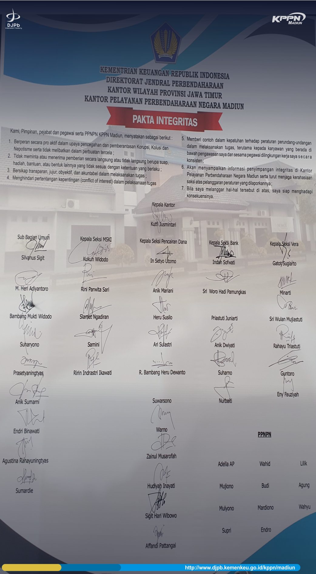 djpb.kemenkeu.go.id/kppn/madiun, Untuk dapat memberantas tindakan-tindakan korupsi, dibutuhkan upaya-upaya yang sistematis dalam memperbaiki sistem kerja, dan meningkatkan integritas setiap level di dalamnya. Salah satu langkah penting dalam upaya sistematis tersebut adalah membangun budaya integritas, dan citra organisasi melalui deklarasi terbuka komitmen pimpinan.