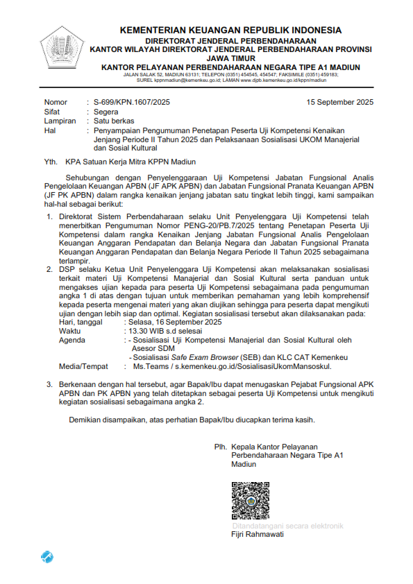 Penyampaian Pengumuman Penetapan Peserta Uji Kompotensi Kenaikan Jenjang Periode II Tahun 2025 dan Pelaksanaan Sosialisasi UKOM Manajerial dan Sosial Kultural