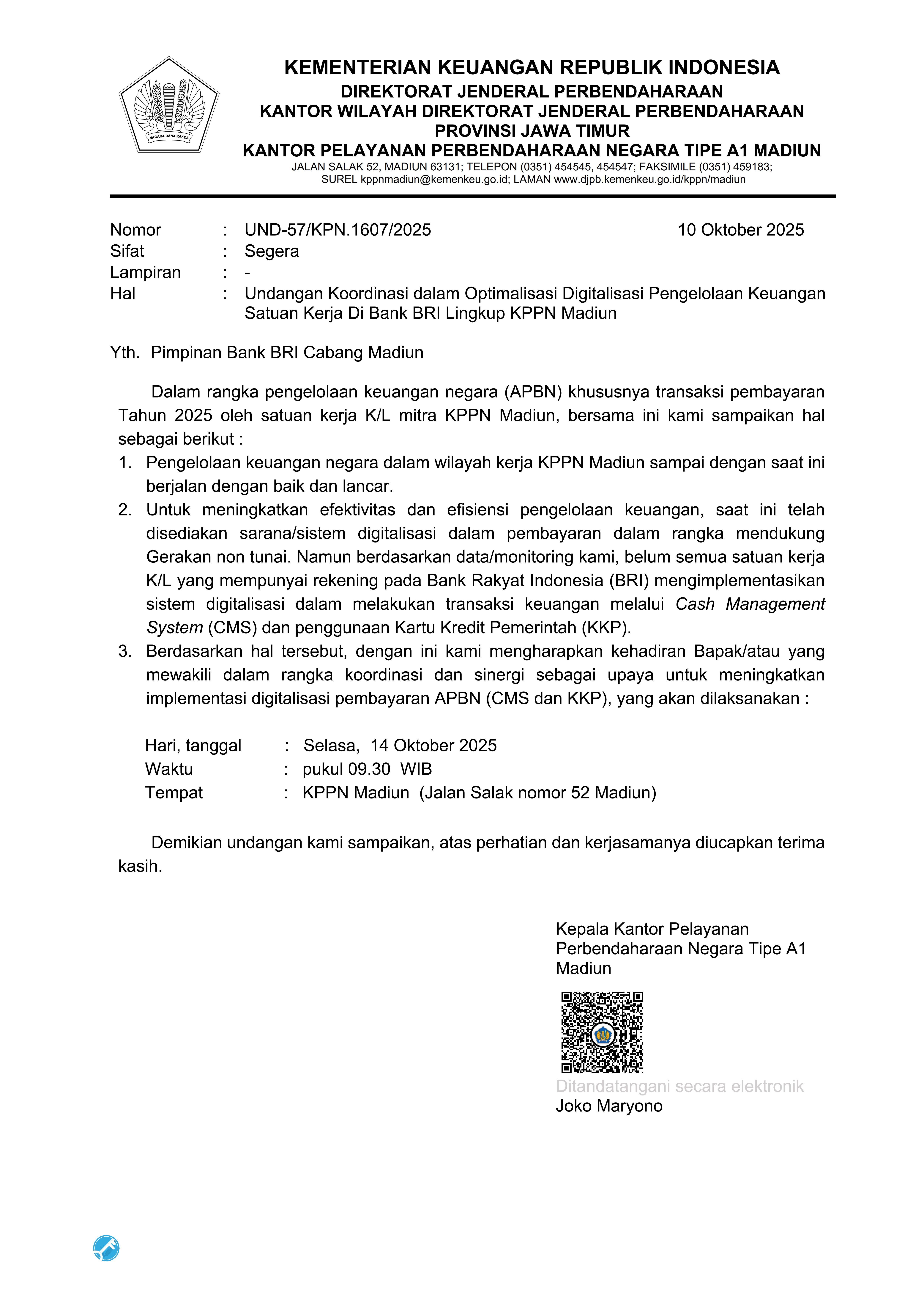 Undangan Koordinasi dalam Optimalisasi Digitalisasi Pengelolaan Keuangan Satuan Kerja Di Bank BRI Lingkup KPPN Madiun