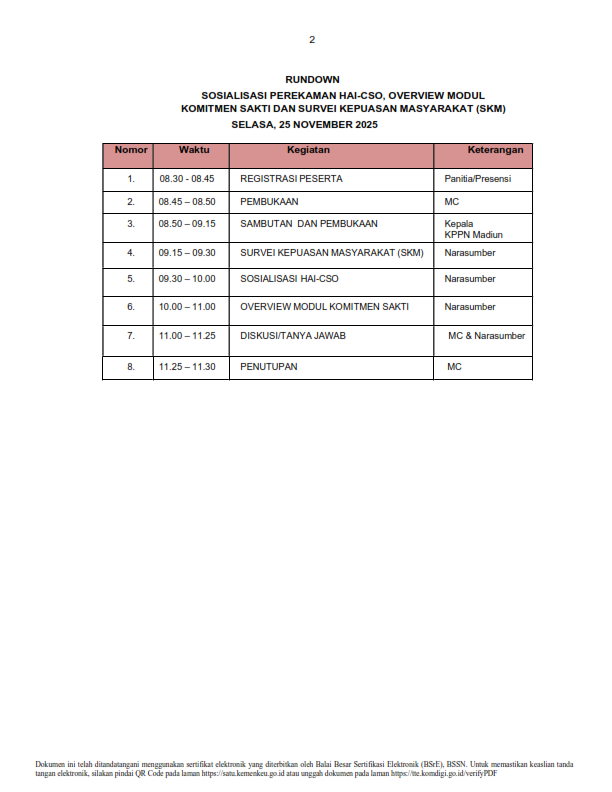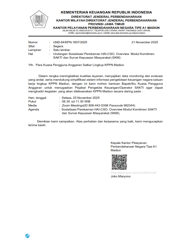 Undangan Sosialisasi Perekaman HAI-CSO, Overview Modul Komitmen SAKTI dan Survei Kepuasan Masyarakat (SKM) UND-64/KPN.1607/2025