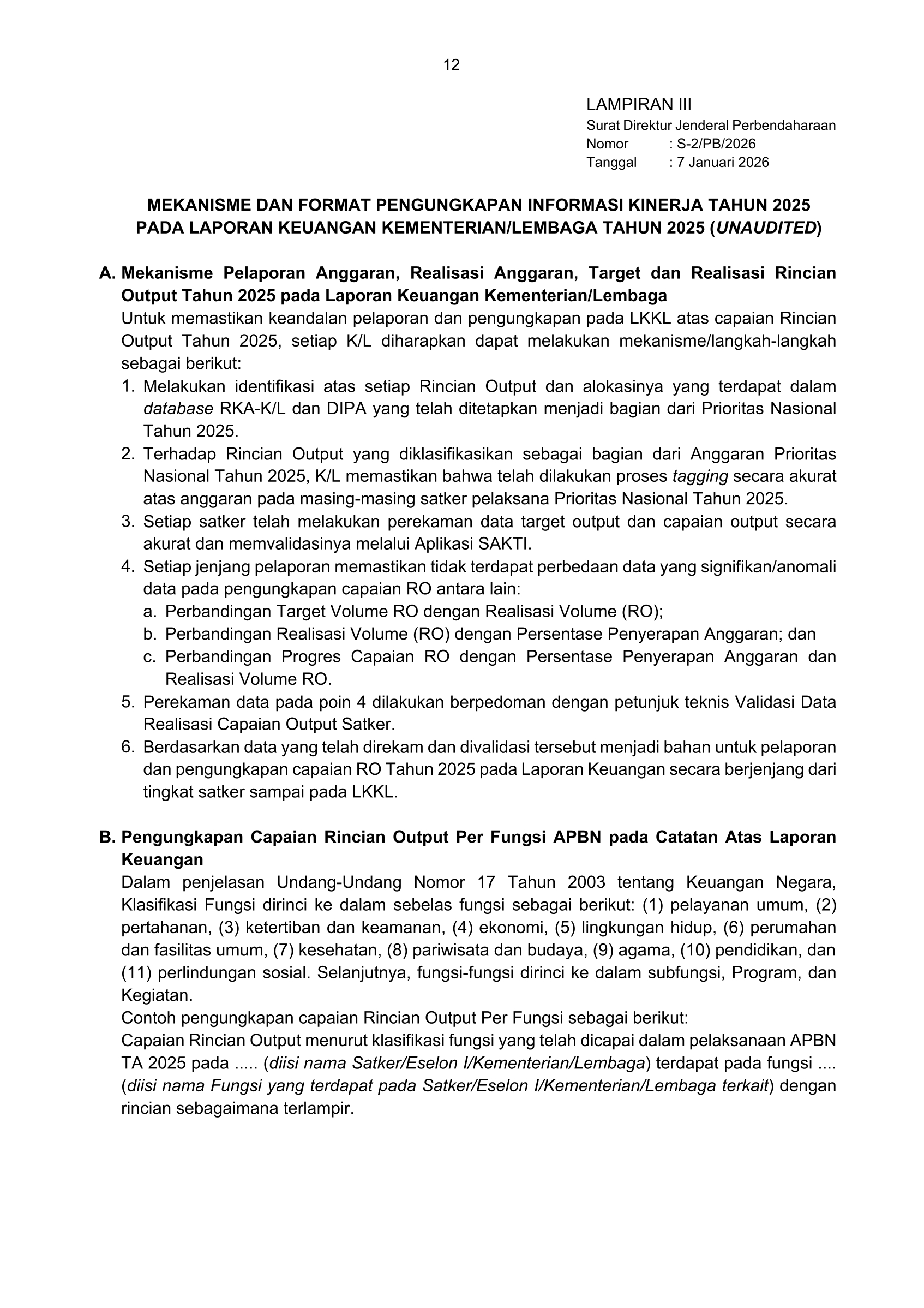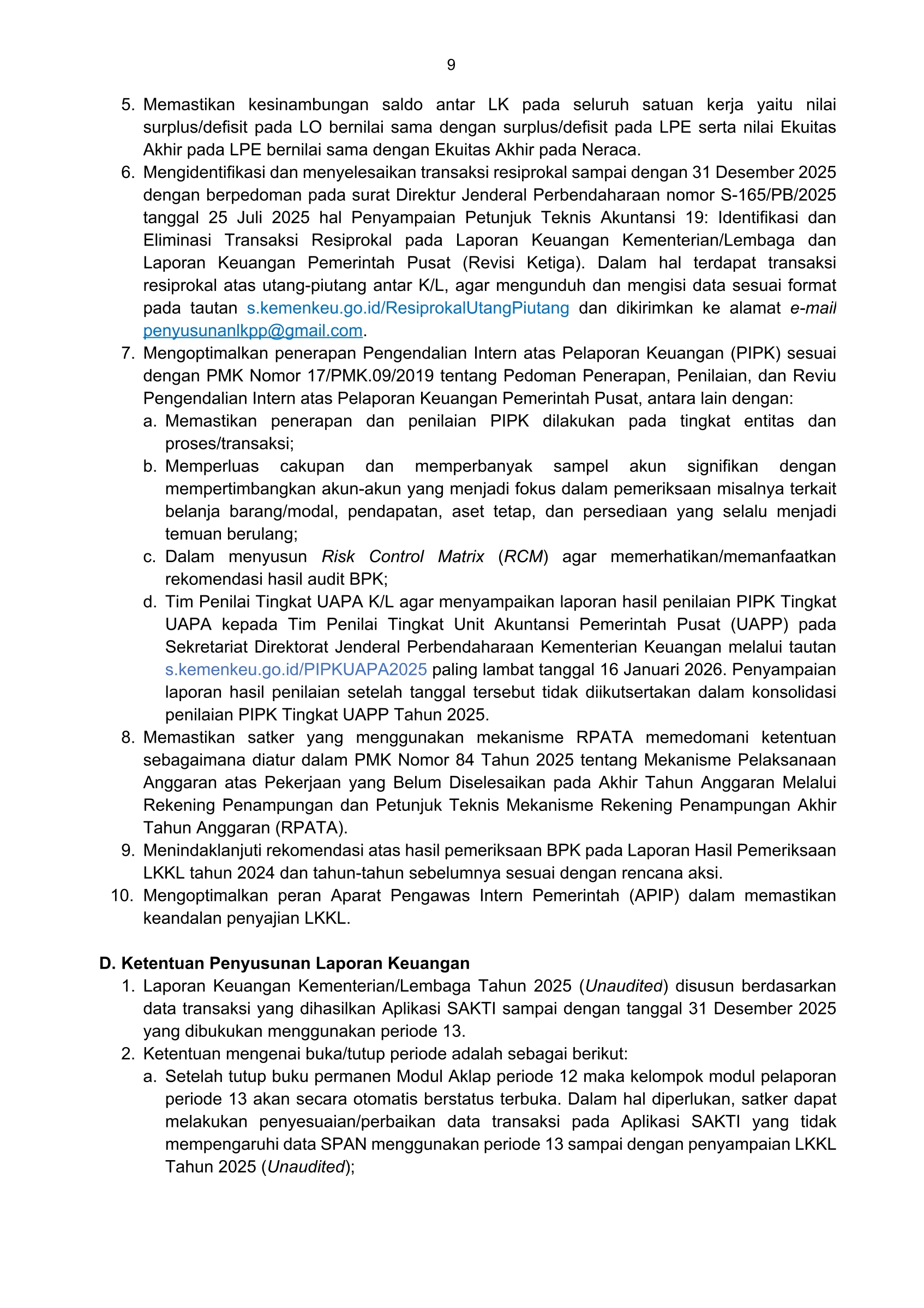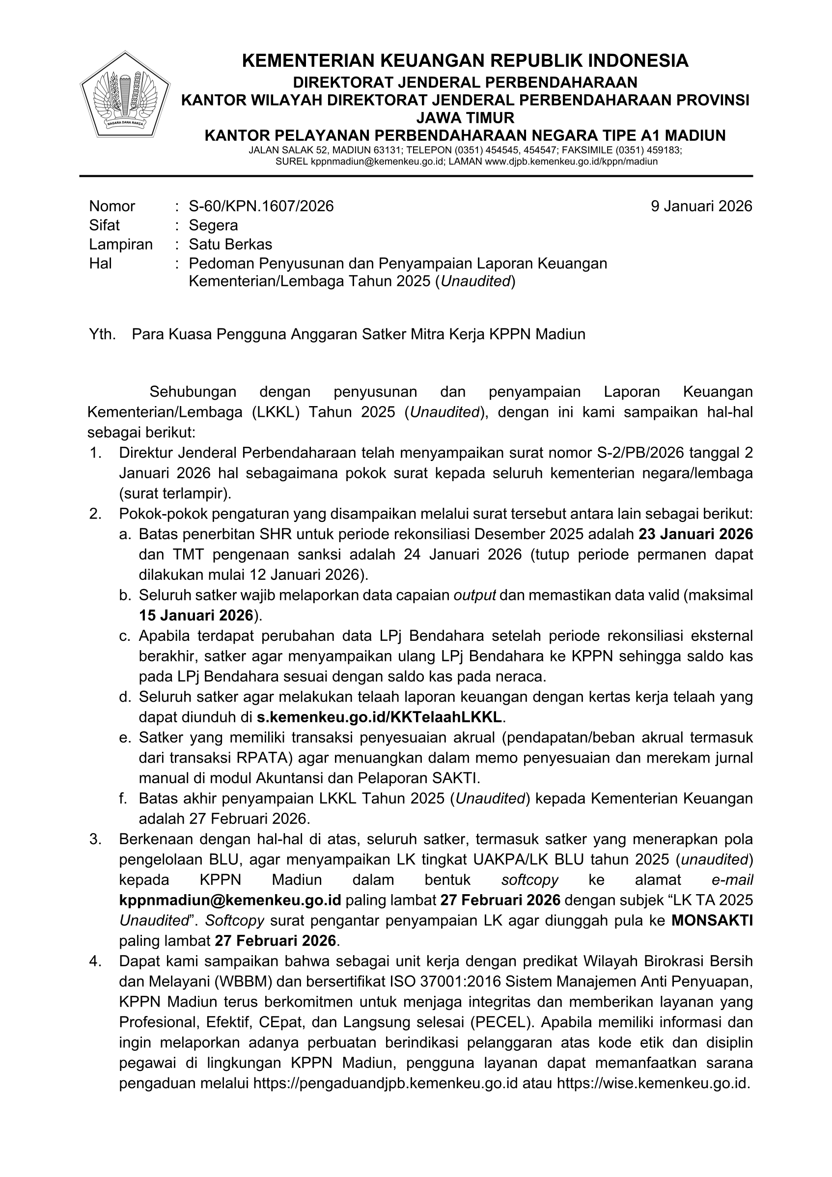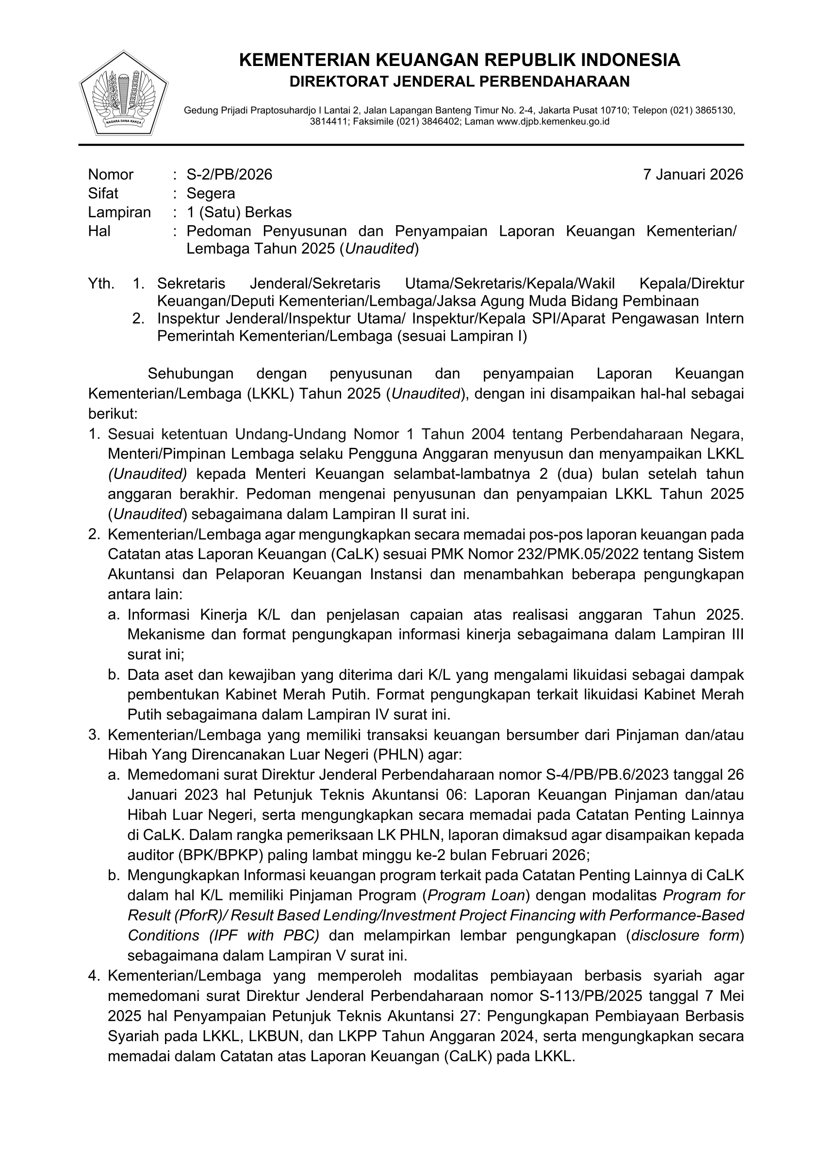 S-60/KPN.1607/2026 Pedoman Penyusunan dan Penyampaian Laporan Keuangan Kementerian/Lembaga Tahun 2025 (Unaudited)