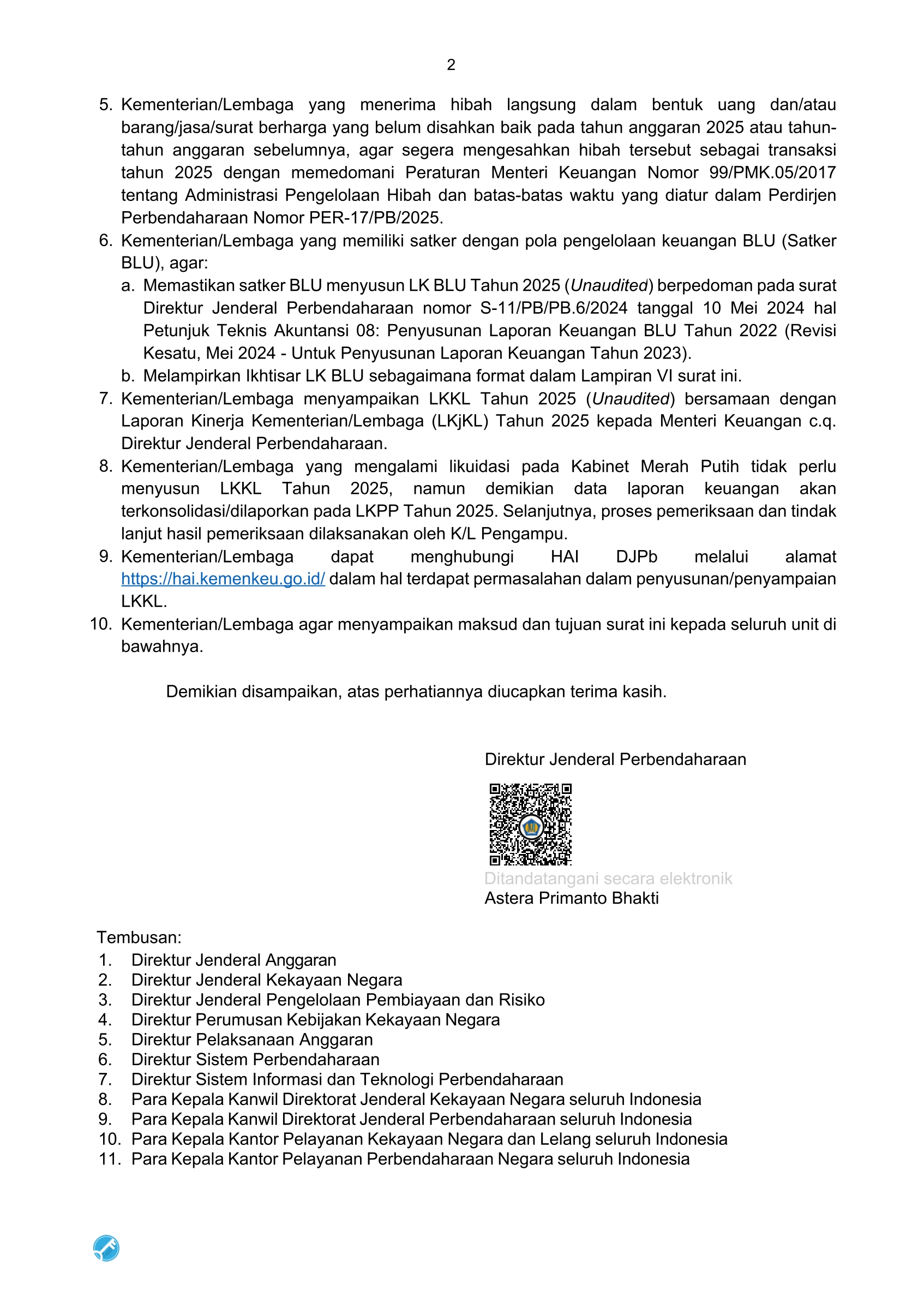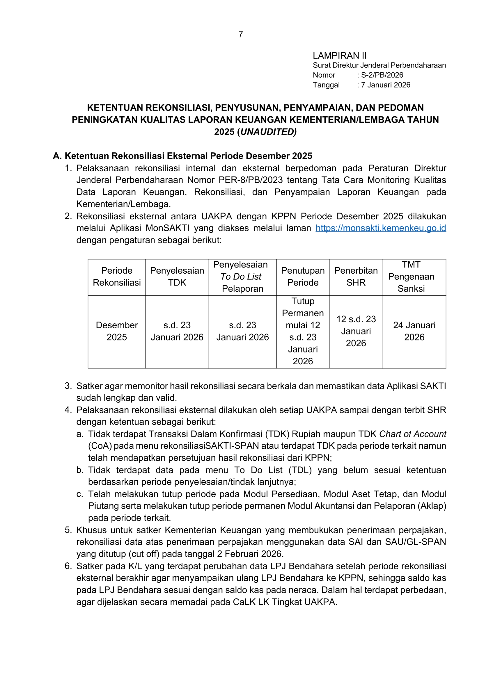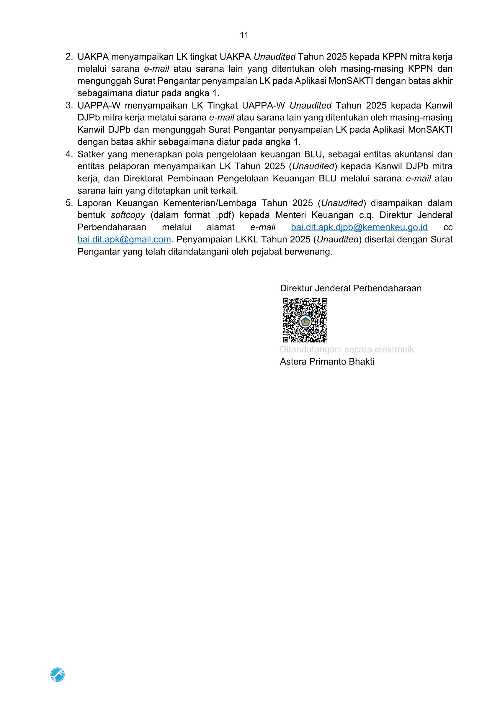 S-60/KPN.1607/2026 Pedoman Penyusunan dan Penyampaian Laporan Keuangan Kementerian/Lembaga Tahun 2025 (Unaudited)