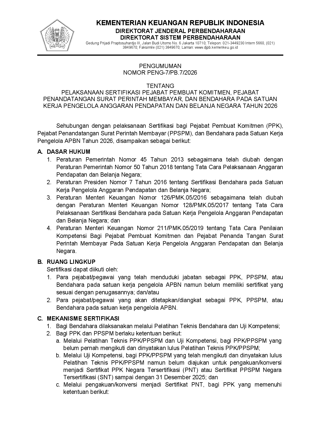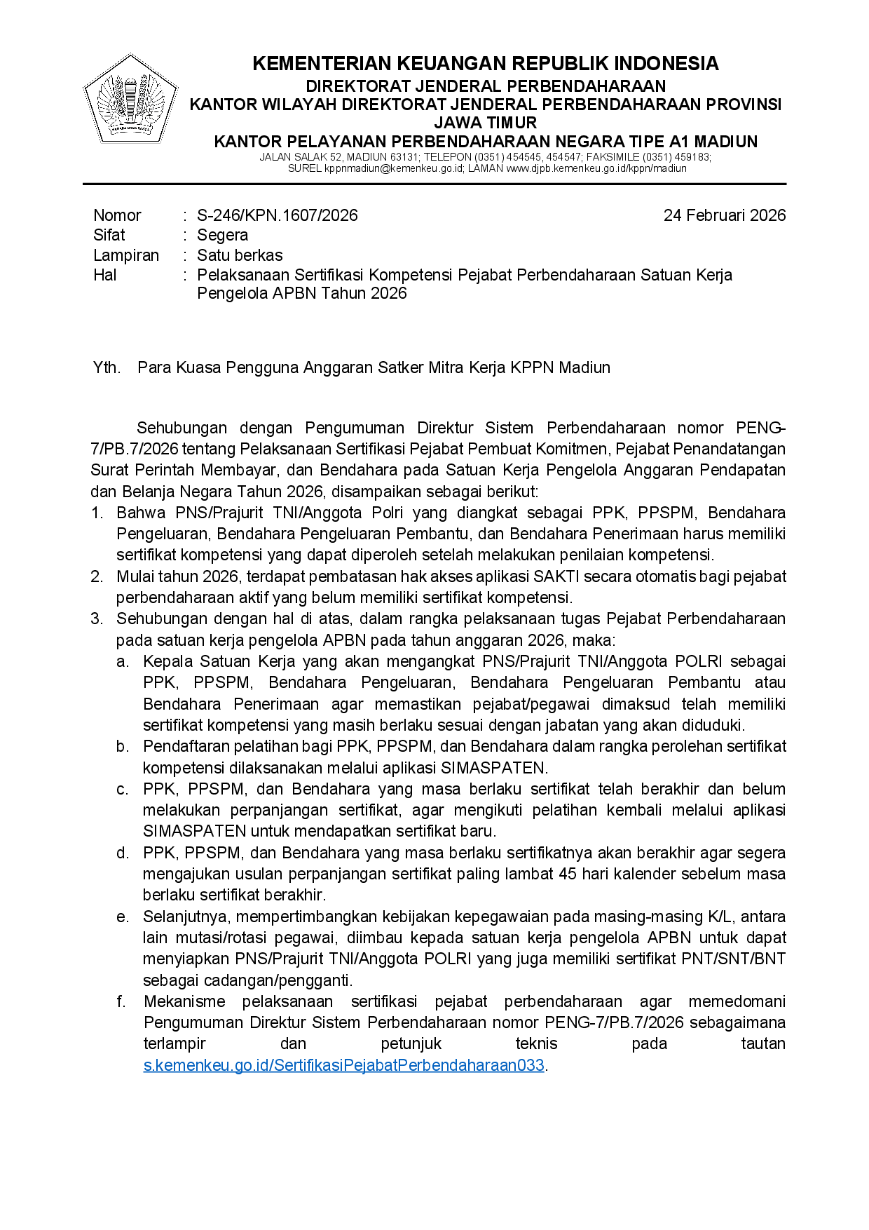 S-246/KPN.1607/2026 Tentang Pelaksanaan Sertifikasi Kompetensi Pejabat Perbendaharaan Satuan Kerja Pengelola APBN Tahun 2026