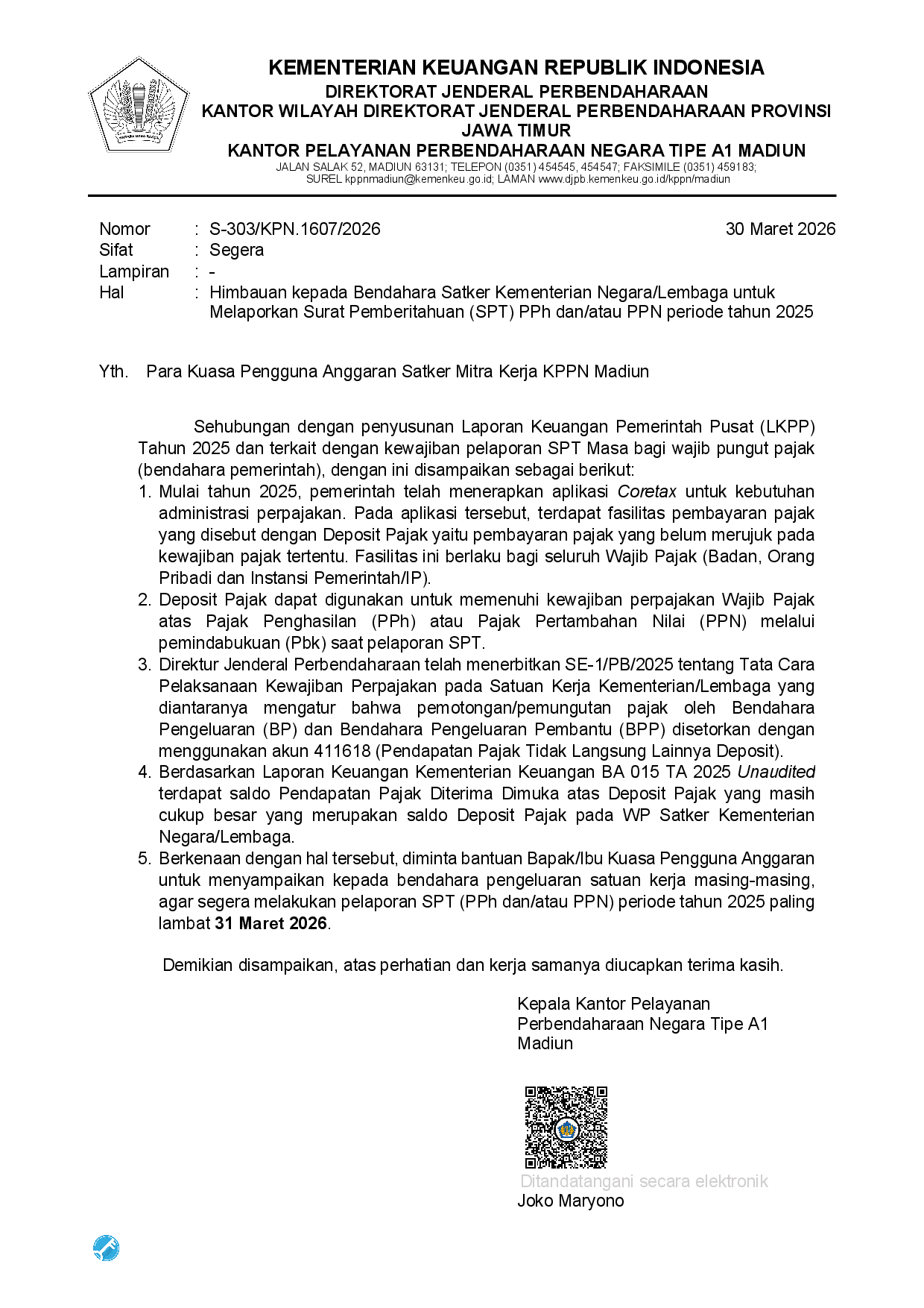S-303/KPN.1607/2026 Tentang Himbauan kepada Bendahara Satker Kementerian Negara/Lembaga untuk Melaporkan Surat Pemberitahuan (SPT) PPh dan/atau PPN periode tahun 2025