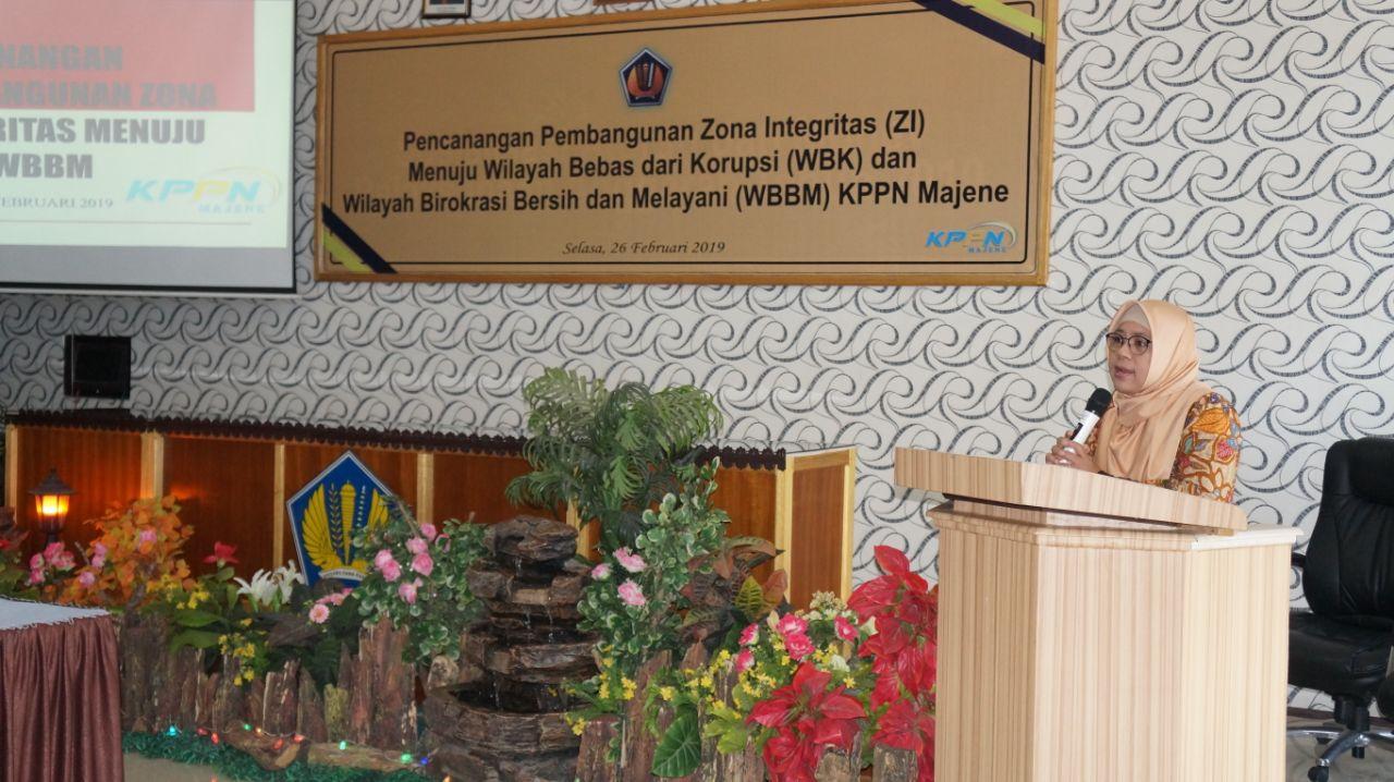 Majene, 26/02/2019. KPPN Majene telah melaksanakan kegiatan Pencanaan Zona Integritas Wilayah Bebas dari Korupsi. Dalam rangka mempersiapkan tahapan pembangunan Zona Integritas (ZI) Menuju Wilayah Bebas Korupsi (WBK) dan Wilayah Birokrasi Bersih Melayani (WBBM), Plt Kepala Kantor Wilayah DJPB Sulawesi Barat, Ibu Endah Martiningrum memberikan pembekalan terkait apa yang harus dipersiapkan oleh jajarannya dalam membangun ZI Menuju WBK/WBBM. Pimpinan beserta jajaran pegawai KPPN Majene sepakat berkomitmen untuk mewujudkan WBK/WBBM melalui reformasi birokrasi khususnya dalam pencegahan korupsi dan peningkatan kualitas pelayanan publik.