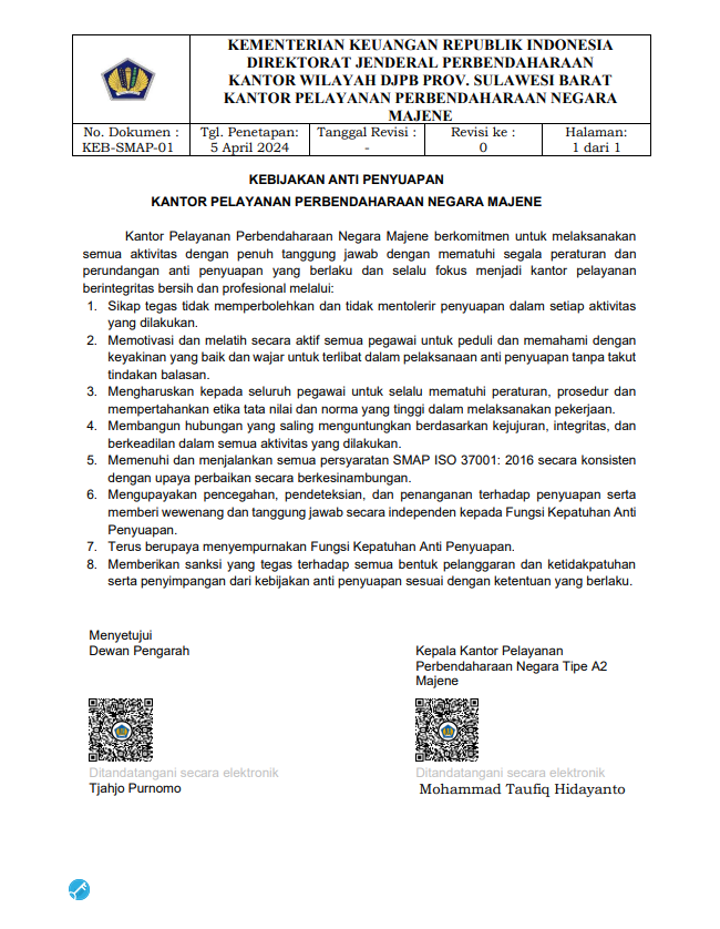 Kantor Pelayanan Perbendaharaan Negara Majene berkomitmen untuk melaksanakan semua aktivitas dengan penuh tanggung jawab dengan mematuhi segala peraturan dan perundangan anti penyuapan yang berlaku dan selalu fokus menjadi kantor pelayanan berintegritas bersih dan profesional melalui: