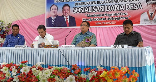 untuk melakukan sosialisasi tentang penggunaan Dana Desa yang diprogramkan oleh pemerintah pusat. Didampingi Gubernur Sulawesi Utara dan Anggota Komisi XI DPR-RI bersama Bupati Bolmong, Menteri Keuangan melaksanakan sosialisasi dihadapan Kepala SKPD, seluruh Camat serta Kepala Desa se-Bolmong.