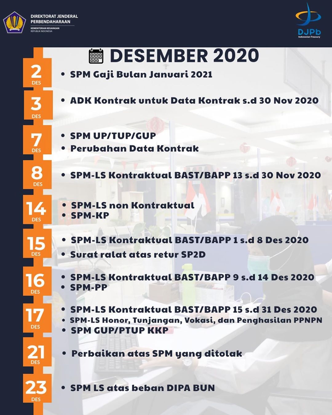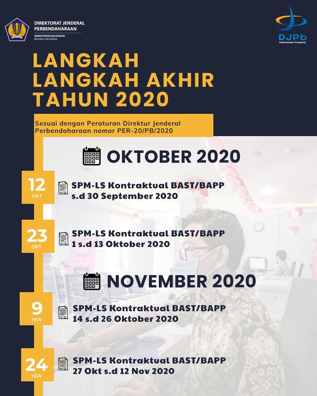Berikut kami sampaikan surat Kepala KPPN Makassar I Nomor S-2179/WPB.25/KP.01/2020 tanggal 12 Oktober 2020 hal : Penyampaian Perdirjen Perbendaharaan Nomor PER-20/PB/2020 Tentang Pedoman Pelaksanaan Penerimaan dan Pengeluaran Negara Pada Akhir Tahun Anggaran 2020.