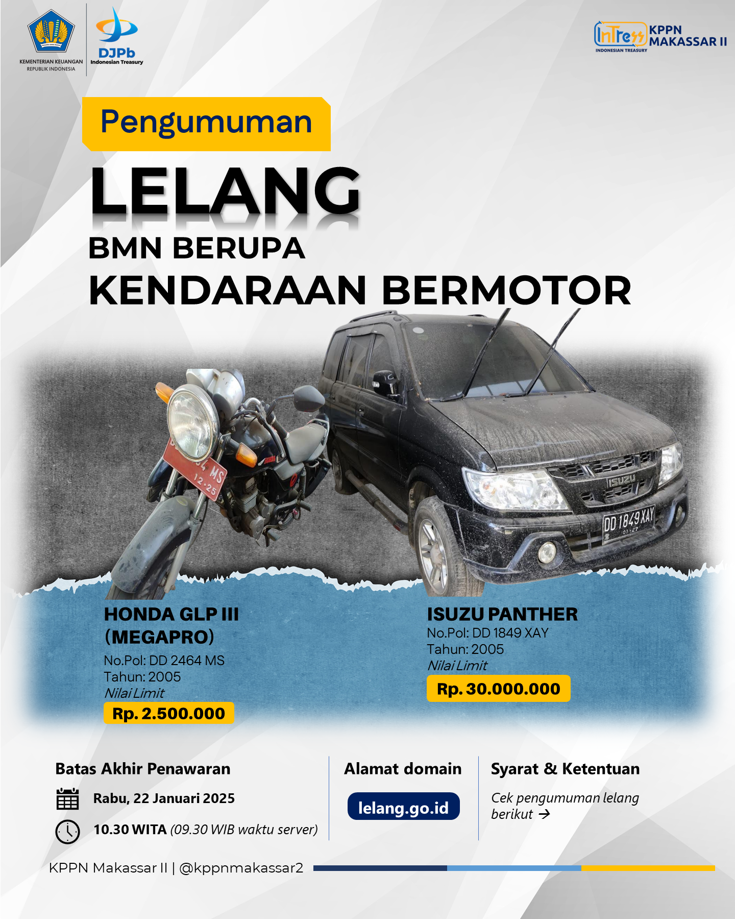 - Untuk informasi lebih lanjut dan syarat lelang, silakan menghubungi KPPN Makassar II atau mengakses [link resmi].