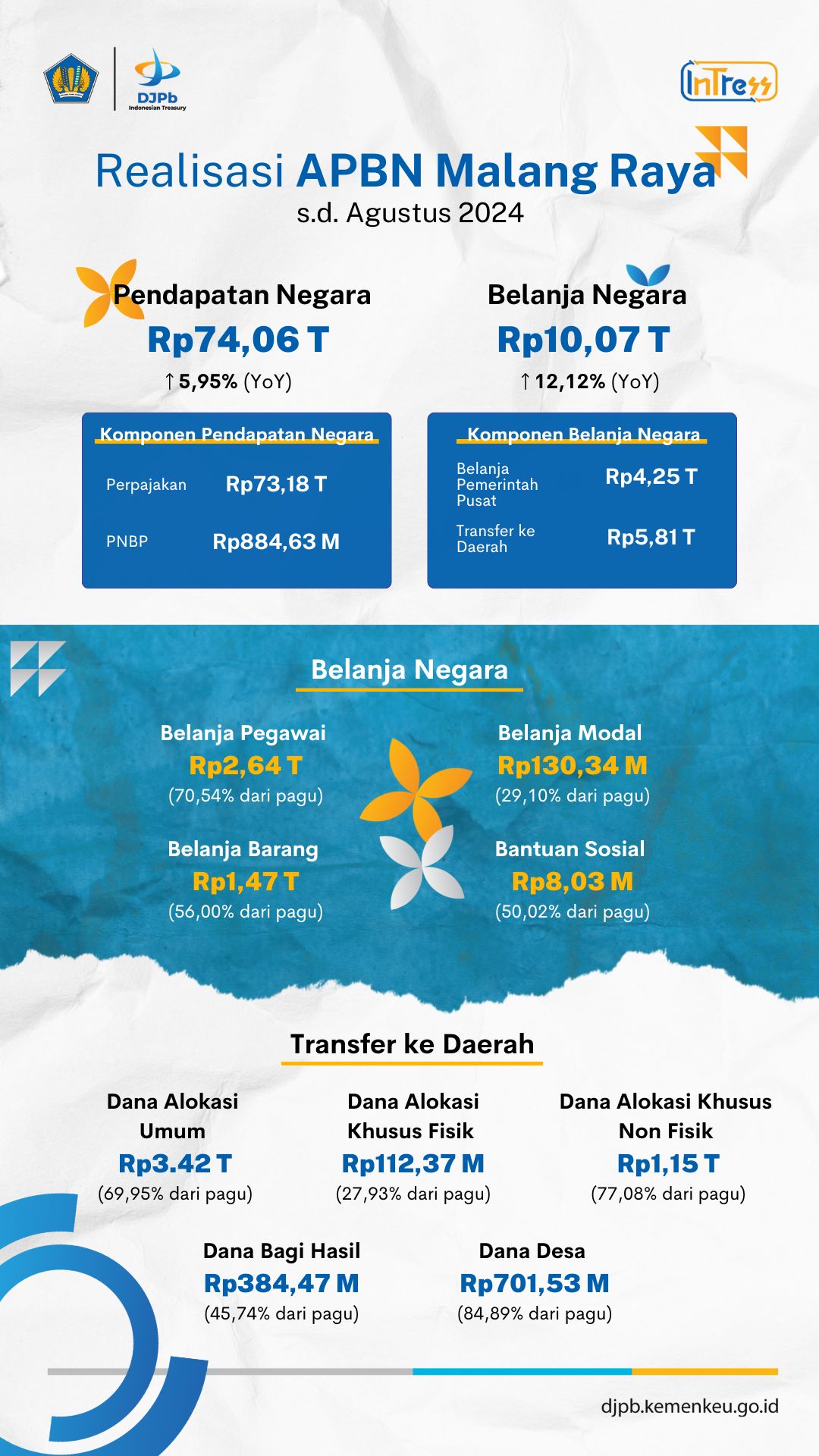 Kemudian, pertumbuhan realisasi TKD didukung oleh tiga komponen utama, yaitu Dana Alokasi Umum (DAU) sebesar Rp3,42 triliun, Dana Desa sebesar Rp701.53 miliar, dan Dana Alokasi Khusus (DAK) sebesar Rp1,26 triliun.