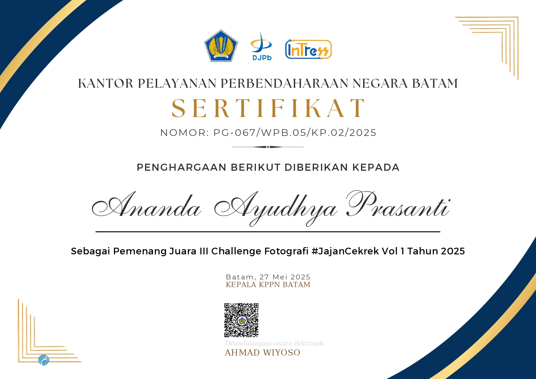 12. Juara III Challenge Fotografi UMKM yang diselenggarakan oleh KPPN Batam atas nama Ananda Ayudhya Prasanti.