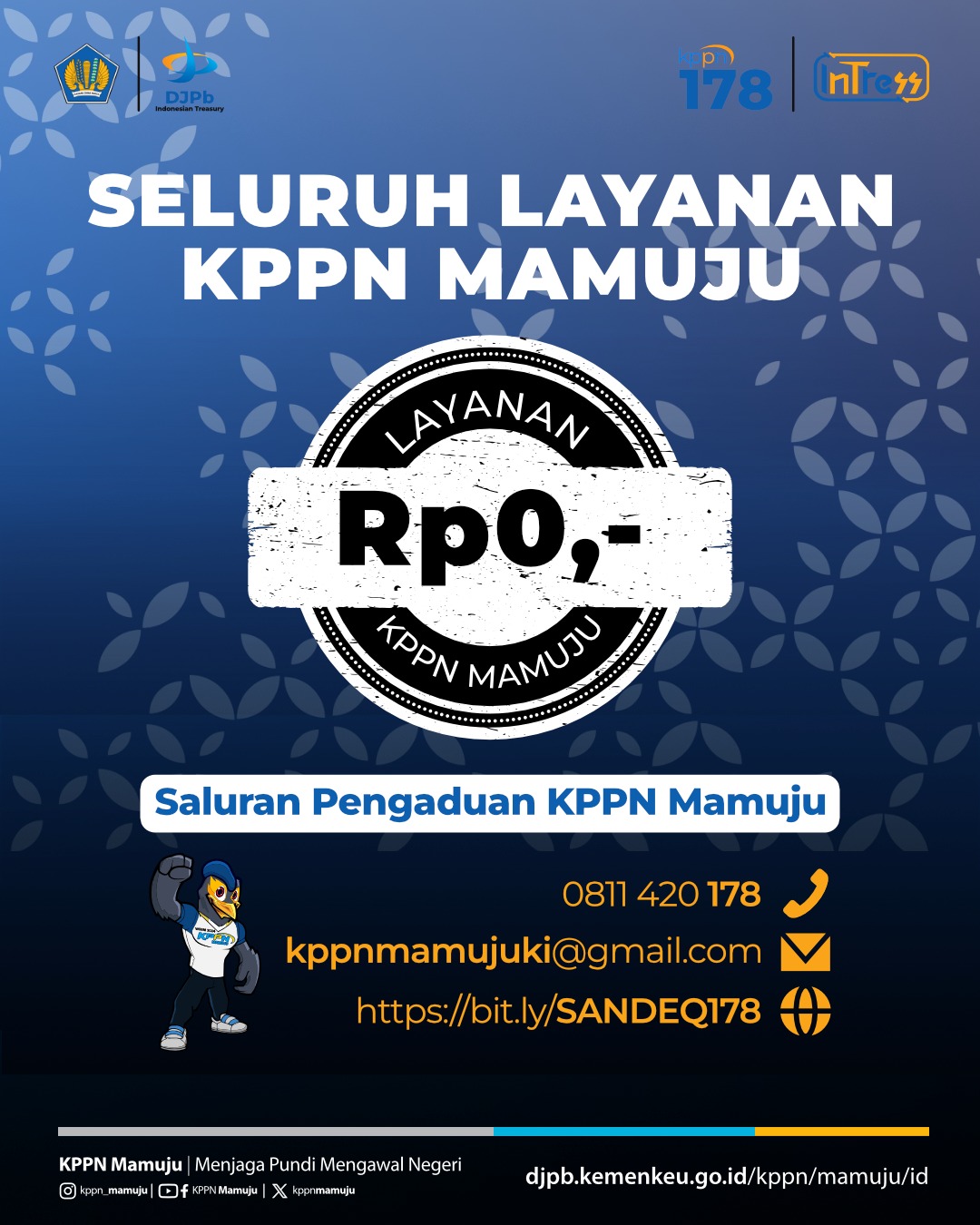 Jangan ragu dan jangan sungkan kepada kami. Saran dan masukan dari Bapak/Ibu sangat berharga untuk perkembangan KPPN Mamuju pada waktu mendatang. Kami akan selalu berupaya untuk memberikan pelayanan yang terbaik untuk seluruh stakeholders KPPN Mamuju.