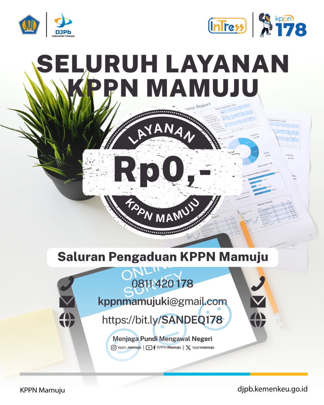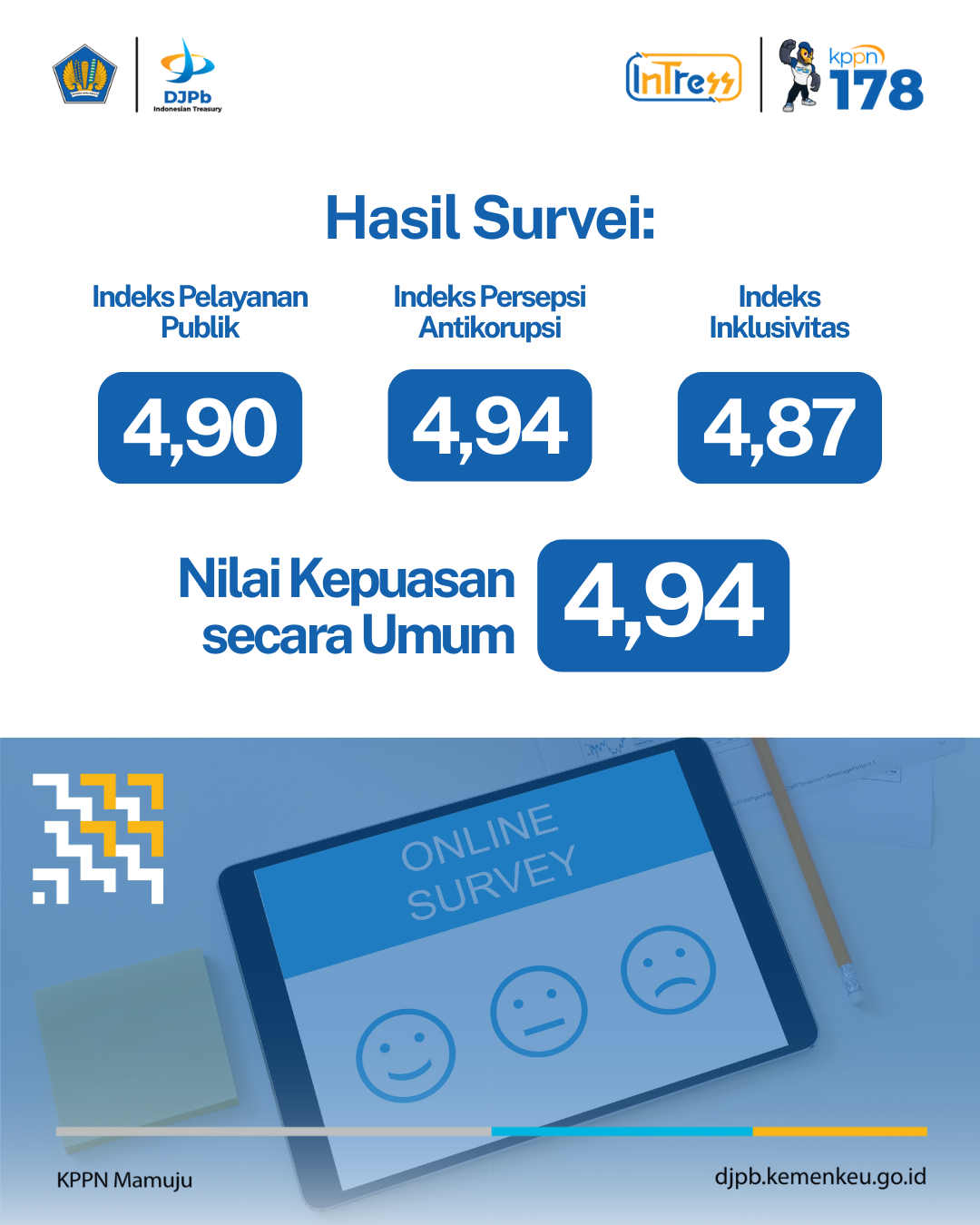 KPPN Mamuju menyampaikan apresiasi dan terima kasih kepada seluruh satuan kerja mitra atas partisipasi dan kepercayaannya dalam Survei Kepuasan Masyarakat Triwulan IV Tahun 2025. Hasil survei ini menjadi refleksi sekaligus pijakan bagi kami untuk terus melakukan perbaikan, menjaga integritas, serta menghadirkan pelayanan publik yang semakin berkualitas, inklusif, dan berkelanjutan. Mari terus memperkuat sinergi dan kolaborasi demi pelayanan yang semakin baik ke depannya. #SKM |
