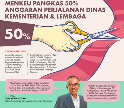 Presiden Prabowo Subianto meminta seluruh Kementerian/Lembaga (K/L) untuk memangkas anggaran perjalanan dinas hingga 50% pada akhir tahun 2024 ini. Langkah ini dilakukan sebagai efisiensi anggaran terutama agar anggaran dapat digunakan untuk membiayai program prioritas pemerintah.