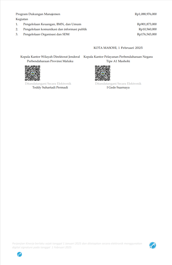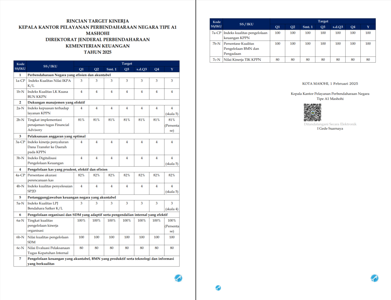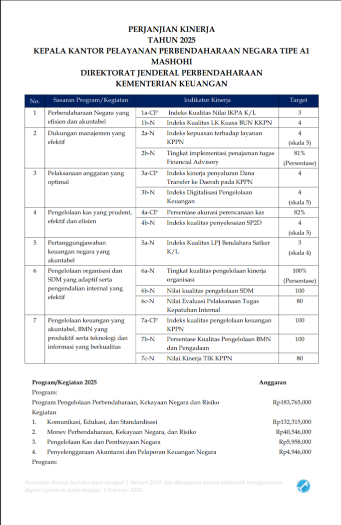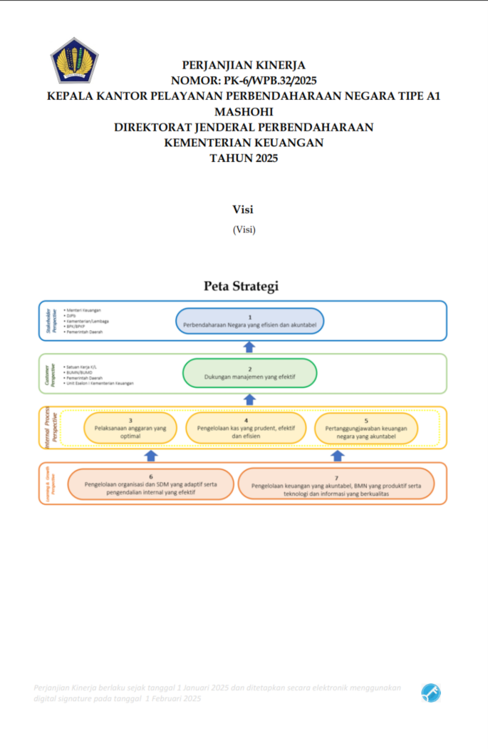 Dalam rangka mewujudkan akuntabilitas, transparansi, dan kinerja aparatur sipil negara yang lebih baik, perlu untuk sebuhah organisasi mempublikasikan dokumen Perjanjian Kinerja (PK) Kepala KPPN KPPN Tipe A1 Masohi Tahun 2025. Dokumen ini merupakan kesepakatan antara Pimpinan KPPN Tipe A1 Masohi dengan Kepala Kantor Wilayah Direktorat Jenderal Perbendaharaan Provinsi Maluku, yang berisikan penugasan program/kegiatan beserta indikator kinerja. Publikasi ini sangat penting sebagai momentum untuk mengawal setiap kinerja Direktorat Jenderal Perbendaharaan yang telah di-cascading-kan kepada KPPN Tipe A1 Masohi, menciptakan tolak ukur kinerja yang jelas, serta mendorong komitmen dan perbaikan berkelanjutan dalam peningkatan kualitas pelayanan publik.