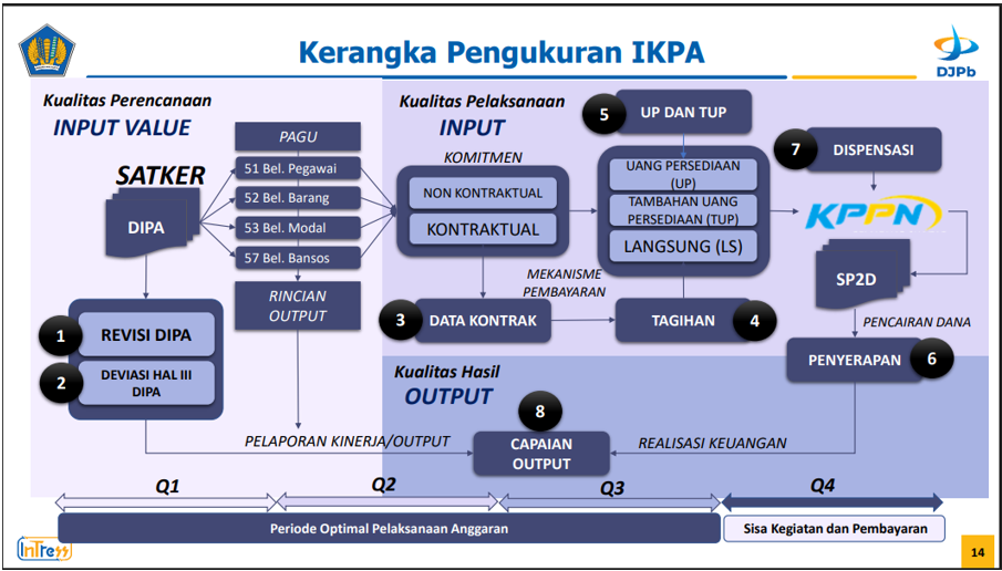 Pengukuran dan penilaian aspek kualitas perencanaan pelaksanaan anggaran, merupakan penilaian terhadap kesesuaian antara pelaksanaan anggaran dengan yang direncanakan dan ditetapkan dalam DIPA. Indikator kinerja untuk pengukuran dan penilaian aspek kualitas perencanaan pelaksanaan anggaran terdiri dari: a. revisi DIPA; dan b. deviasi halaman III DIPA.