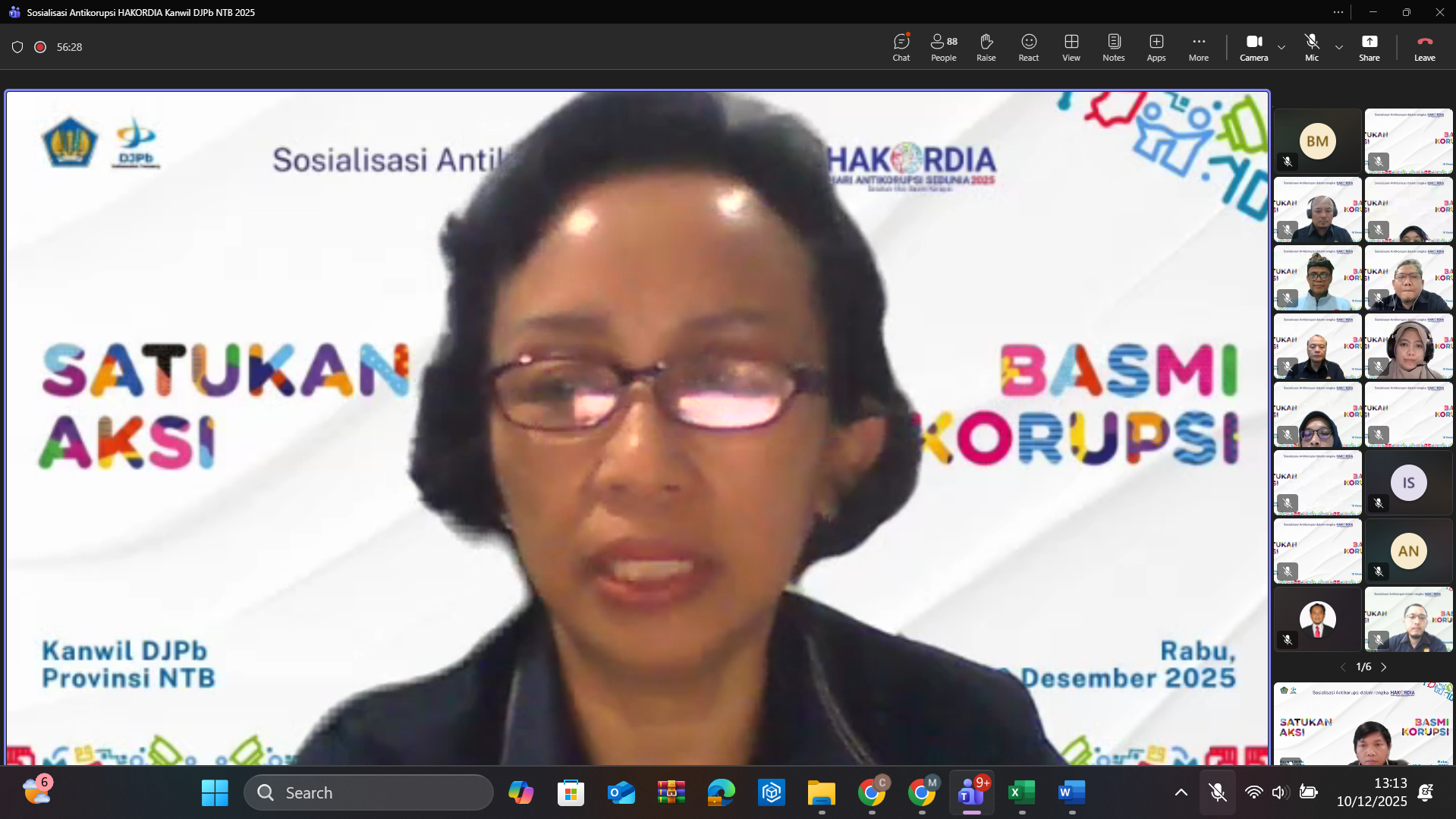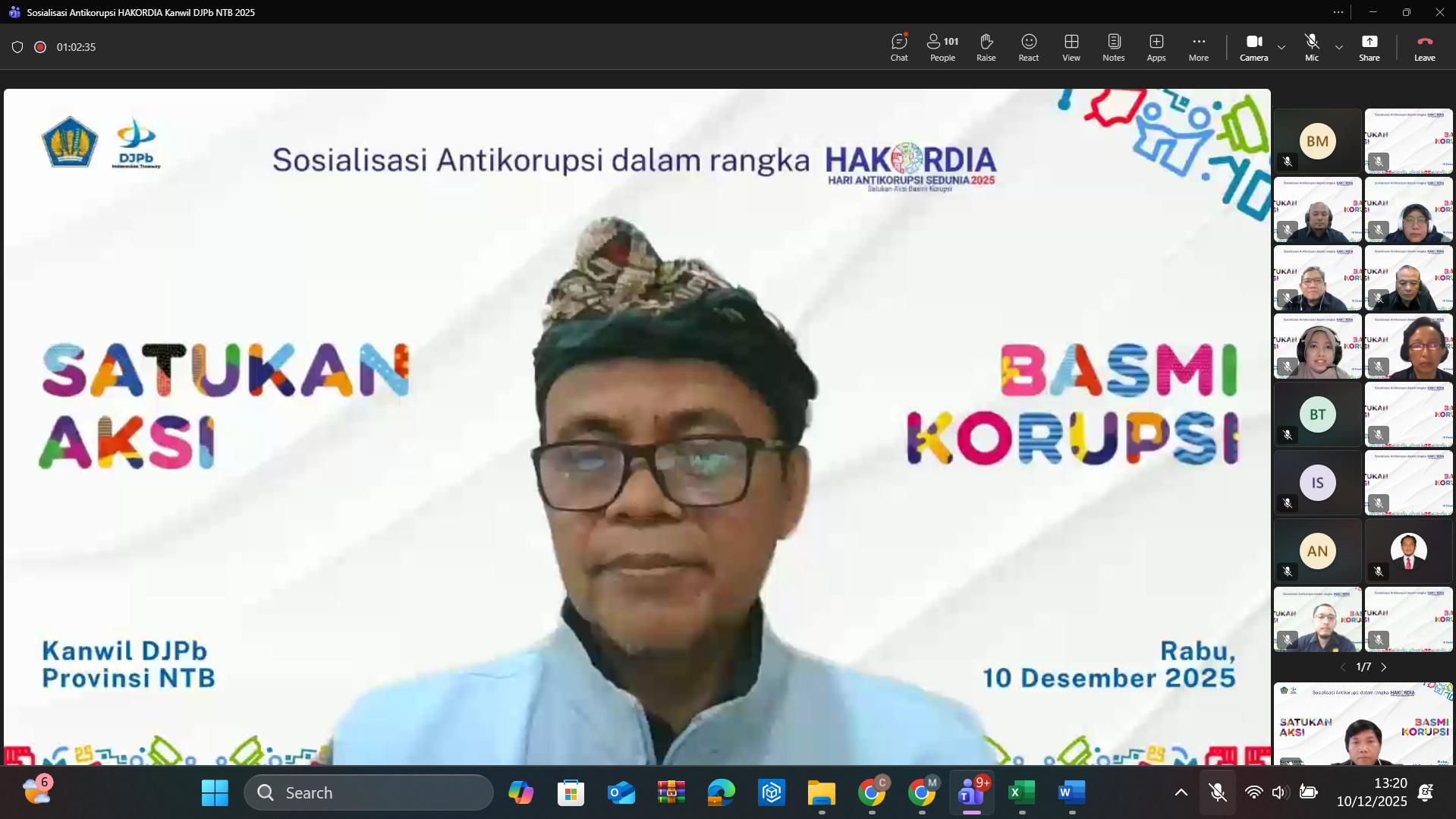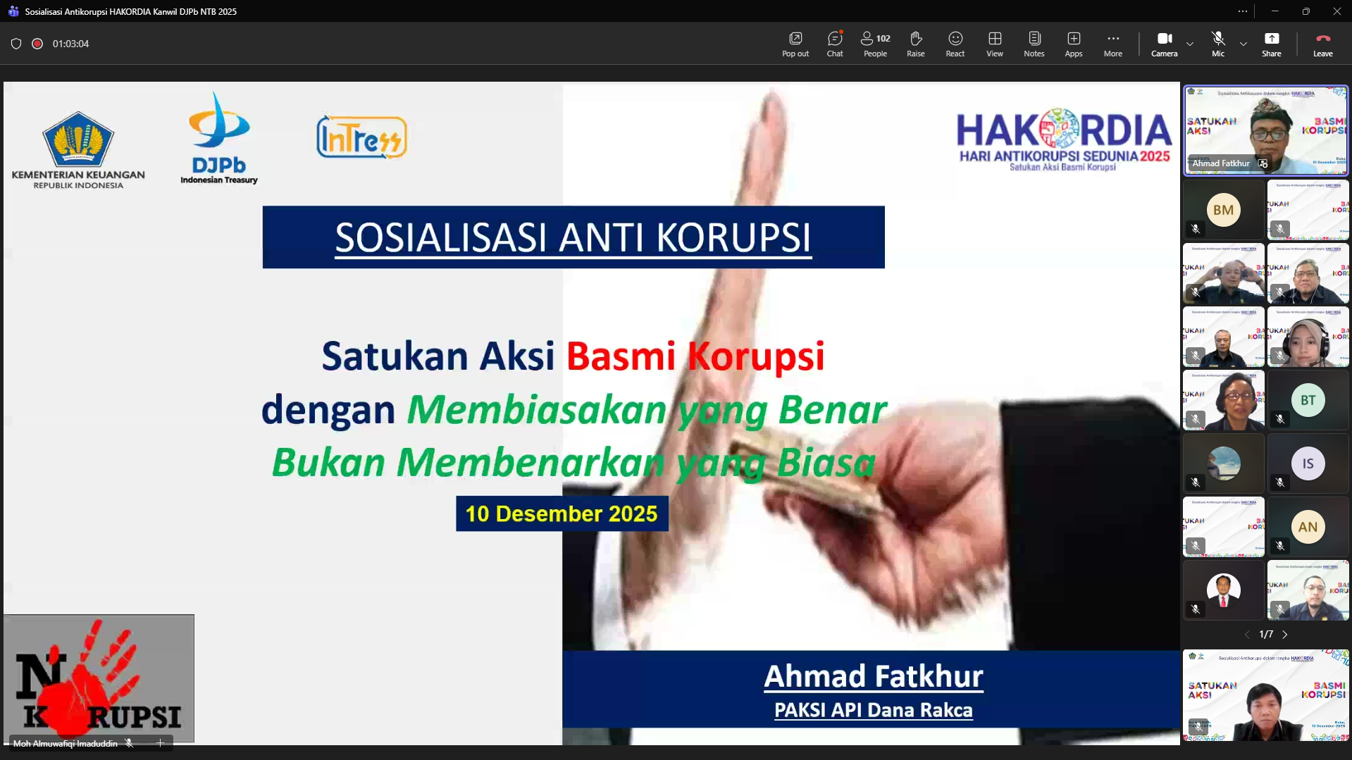Sosialisasi Antikorupsi dalam rangka HAKORDIA 2025 dilaksanakan pada hari Rabu tanggal 10 Desember 2025 melalui daring di Teams Meeting Kanwil DJPb Provinsi Nusa Tenggara Barat. Selaku narasumber adalah Ahmad Fatkhur, S.E., M.M., (PAKSI) Penyuluh Antikorupsi Kementerian Keuangan yang sehari-hari menjabat sebagai Kepala Bidang Supervisi KPPN dan Kepatuhan Internal pada Kantor Wilayah Ditjen Perbendaharaan Provinsi Bali. Kegiatan sosialisasi ini diikuti oleh seluruh pejabat dan pegawai di lingkungan Kanwil DJPb Provinsi NTB, KPPN lingkup Kanwil DJPb Provinsi NTB, Kanwil DJPb Provinsi Bali dan stakeholder eksternal yang ikut serta diantaranya Kantor Bea Cukai Mataram, BPKP Perwakilan NTB, BKAD Kota Bima, BPKAD Kabupaten Lombok Barat, IPDN Kampus NTB dan lainnya.