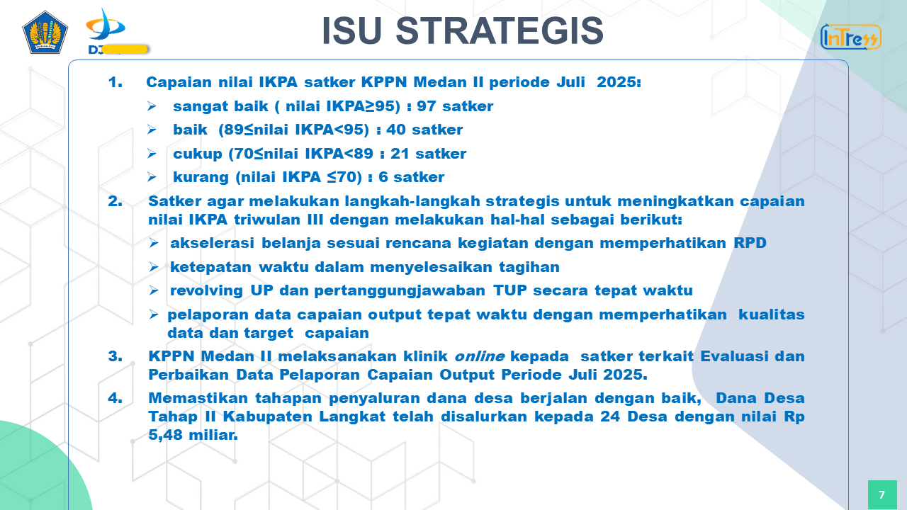 Kegiatan ini dilaksanakan dalam rangka memberikan informasi kepada Satuan Kerja terkait Kinerja Anggaran Tahun 2025. Selain itu, dengan terlaksananya kegiatan ini, diharapkan dapat menjadi pedoman bagi Satuan Kerja Lingkup KPPN Medan II untuk melaksanakan anggaran pada Periode berikutnya.