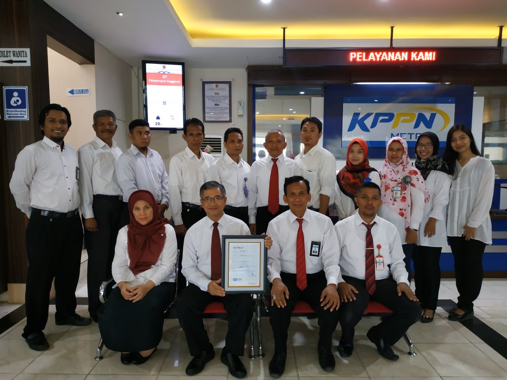 Bertempat di Aula Kantor Wilayah Ditjen Perbendaharaan Provinsi Lampung pada hari Jumat tanggal 23 November 2018 , Kepala Kanwil DJPb Provinsi Lampung, Bpk. Afiker Siringoringo menyerahkan sertifikat ISO 9001:2015 kepada Kepala KPPN Metro, Bpk. Tri Tenggo Sukmono. Sertifikat SNI ISO 9001:2015 ini menjadi bukti bahwa pelayanan KPPN Metro kepada para stakeholders telah berstandar internasional. Keberhasilan KPPN Metro dalam memperoleh sertifikat Sistem Manajemen Mutu ISO 9001:2015 ini merupakan hasil kerja keras seluruh pegawai dan PPNPN di KPPN Metro dalam meningkatkan kinerjanya. Sertifikasi ini juga merupakan pondasi untuk terus mewujudkan layanan berstandar internasional kepada seluruh pengguna stakeholders dengan fokus pada kepuasan pelanggan secara berkelanjutan.