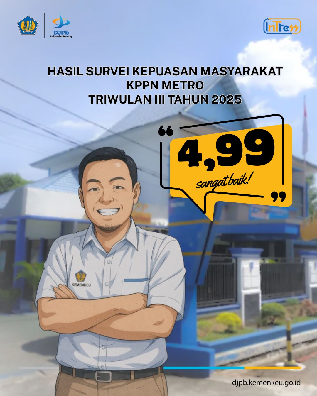 Berdasarkan Surat Kepala KPPN Metro nomor S-530/KPN.0802 / 2025 tanggal 19 Nopember 2025, KPPN Metro telah melaksanakan survei Kepuasan Layanan KPPN secara online kepada Instansi yang dilayani oleh KPPN Metro pada Tahun 2025. Dari perlaksanaan Survei, kami sampaikan hal-hal sebagai berikut:
