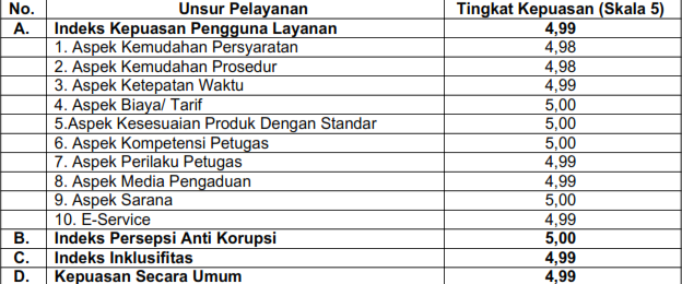 - Indeks tingkat kepuasan satker terhadap layanan KPPN adalah sebesar 4,99 (skala 5) ), dengan rincian hasil survei untuk setiap unsur pertanyaan adalah sebagai berikut:
