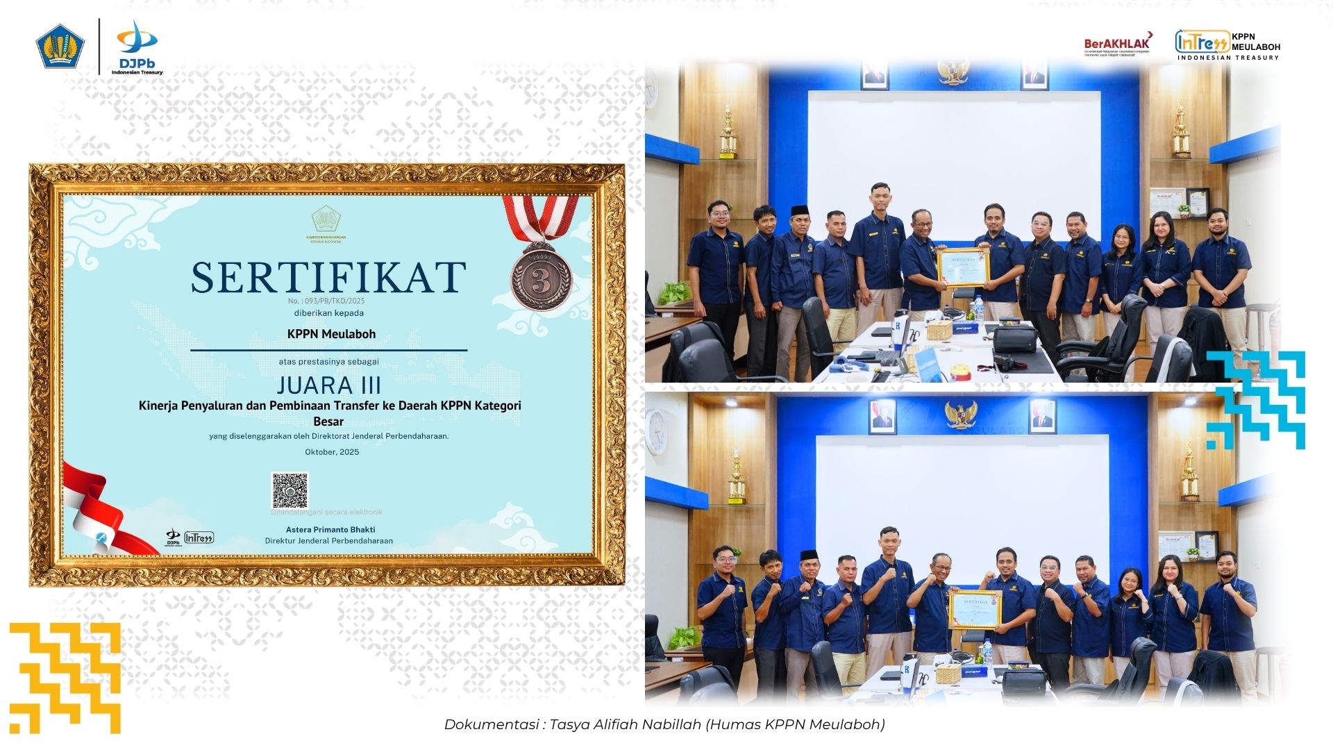 Kantor Pelayanan Perbendaharaan Negara (KPPN) Meulaboh kembali menorehkan prestasi membanggakan di tingkat nasional. Pada tahun 2025, KPPN Meulaboh berhasil meraih Juara III Kinerja Penyaluran dan Pembinaan Transfer ke Daerah Katagori Besar, sebuah penghargaan yang diberikan oleh Direktorat Jenderal Perbendaharaan (DJPb) sebagai bentuk apresiasi atas kinerja optimal dalam mengawal penyaluran Dana Transfer ke Daerah (TKD).