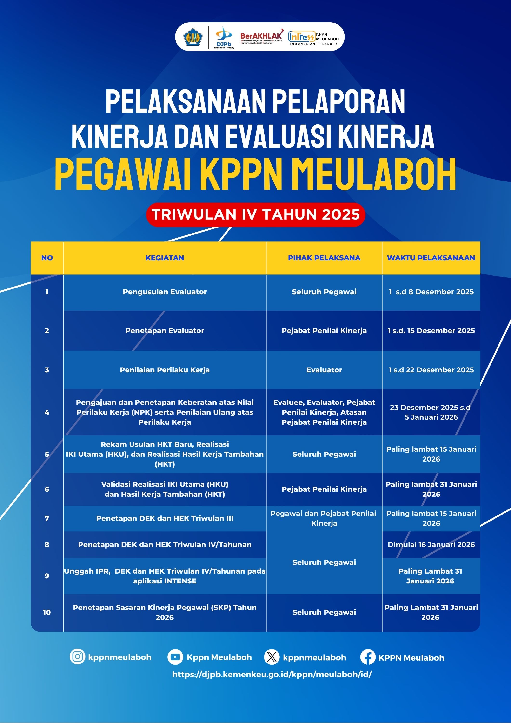 - Bagi pejabat/pegawai yang diusulkan kenaikan pangkat dalam periode terdekat, mohon kiranya agar dilakukan percepatan proses evaluasi kinerja triwulan IV tahun 2025. Atasan langsung dan pengelola kinerja diminta memantau pelaksanaannya dengan tetap memperhatikan validitas data kinerja yang dilaporkan. Tidak diperkenankan untuk merekam realisasi HKU, HKT, dan NKO yang masih bersifat prognosis/belum final;
