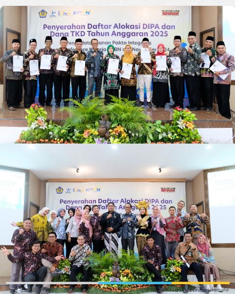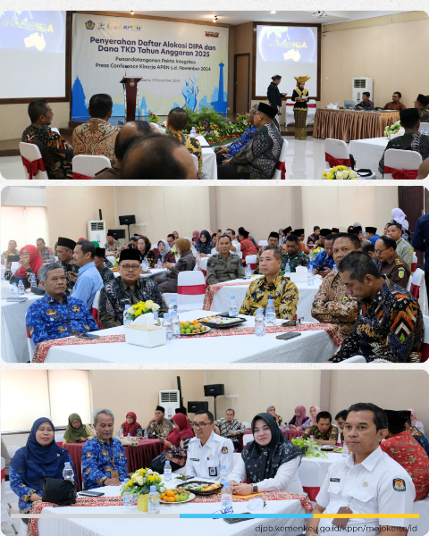 Penyerahan Daftar Isian Pelaksanaan Anggaran (DIPA) Petikan dan Buku Alokasi Transfer ke Daerah (TKD) Tahun Anggaran 2025 untuk satuan kerja kementerian/lembaga dan Pemerintah Kabupaten (Pemkab) Mojokerto dan Jombang setra Kota Mojokerto dilaksanakan secara simbolis pada hari Kamis, 19 Desember 2024 yang berlangsung di Aula Gajah Mada.