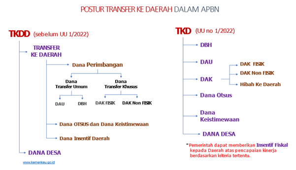 Selanjutnya, untuk Transfer Ke Daerah (TKD), dengan diterbitkannya Undang-Undang Nomor 1 Tahun 2022 tentang Hubungan Keuangan antara Pemerintah Pusat dan Pemerintahan Daerah (HKPD), menyebabkan adanya perubahan struktur transfer ke daerah dalam APBN yang semula menggunakan istilah Transfer Ke Daerah dan Dana Desa (TKDD) menjadi Transfer Ke Daerah (TKD). Secara lengkap struktur Transfer Ke Daerah berdasarkan sebelum dan sesudah UU No.1 Tahun 2022 dapat dilihat pada bagan berikut ini: