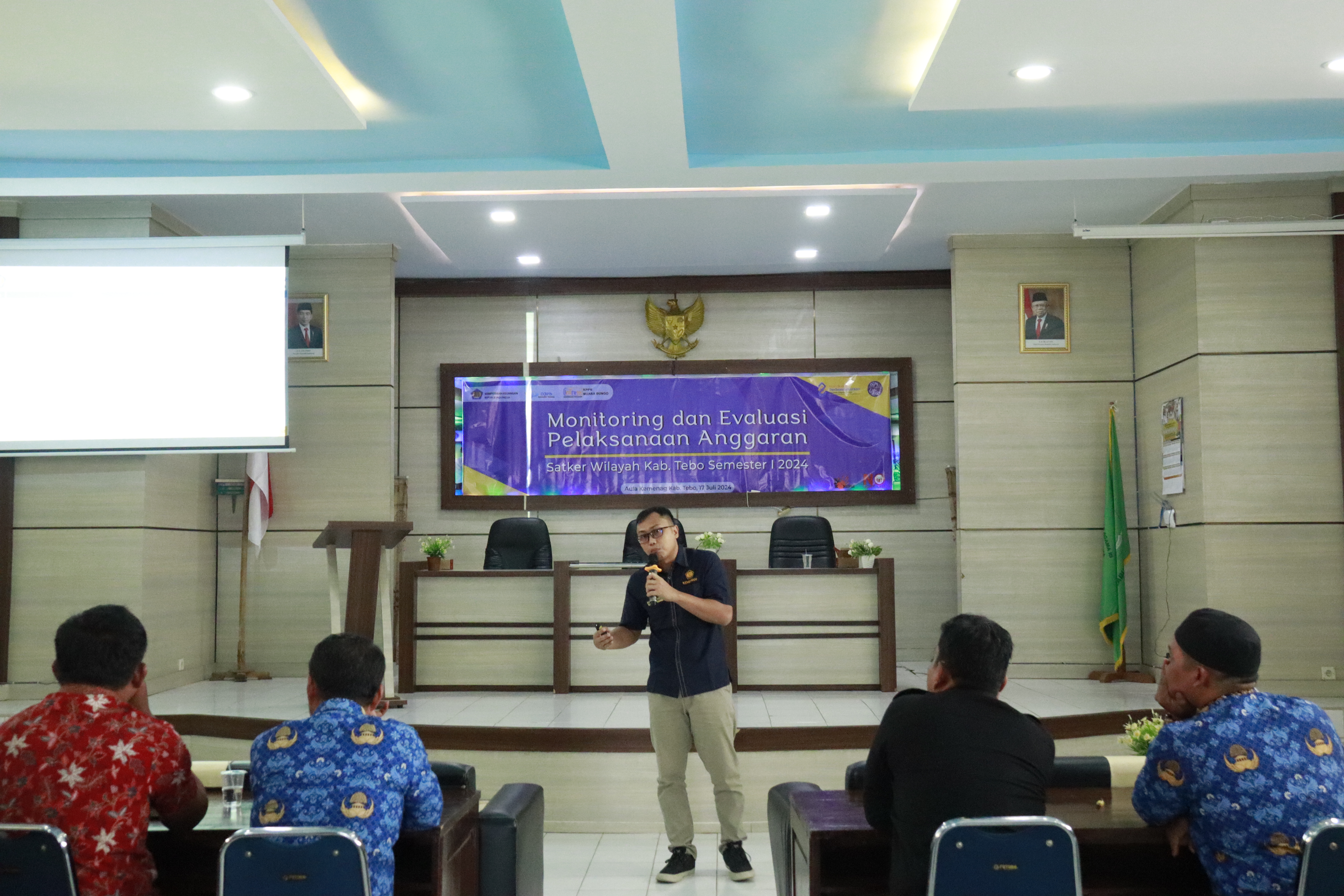Kegiatan dilaksanakan secara luring di gedung aula Kantor Kementerian Agama Kab. Tebo pada hari Rabu, tanggal 17 Juli 2024. Kegiatan diikuti oleh seluruh Satuan Kerja KPPN Muara Bungo wilayah Kab. Tebo. Kegiatan Monitoring Dan Evaluasi Pelaksanaan Anggaran Satker Wilayah Kab. Tebo Semester I 2024 diselenggarakan untuk menyampaikan perubahan penilaian IKPA tahun 2024 sesuai PER-5/PB/2024 tanggal 02 Mei 2024, menyampaikan evaluasi nilai IKPA triwulan II 2024 khusus satuan kerja wilayah Kab. Tebo, dan bimbingan teknis terkait pendaftaran sertifikat kompetensi di aplikasi Simaspaten.