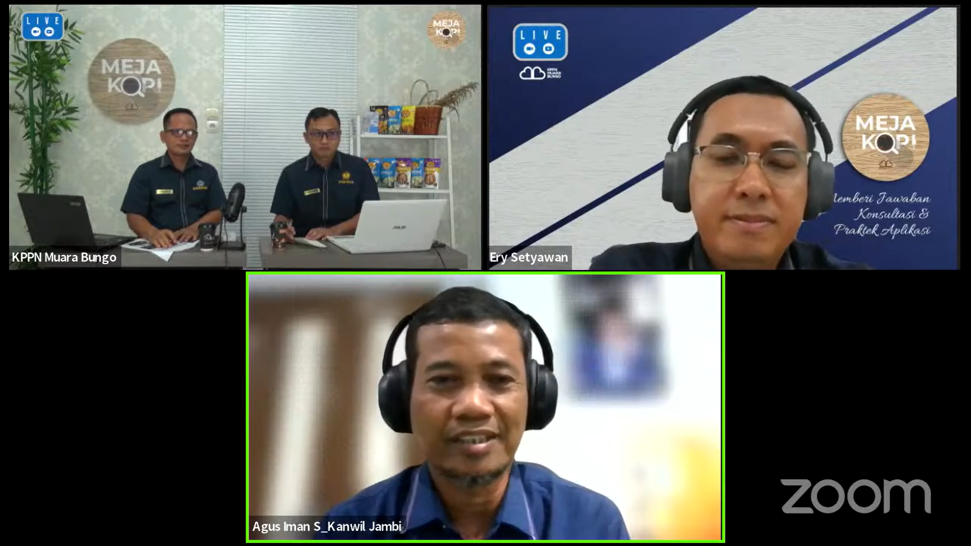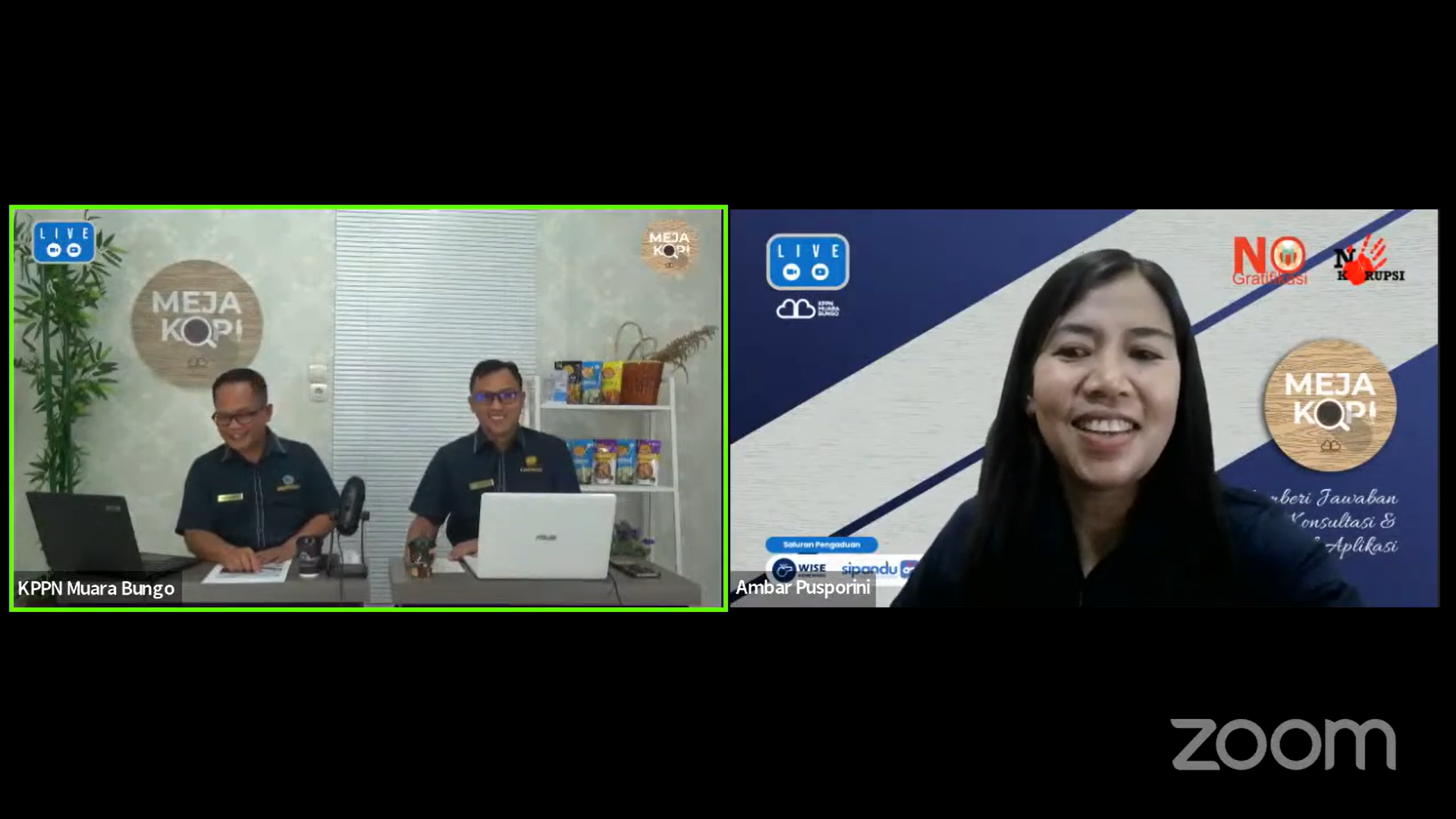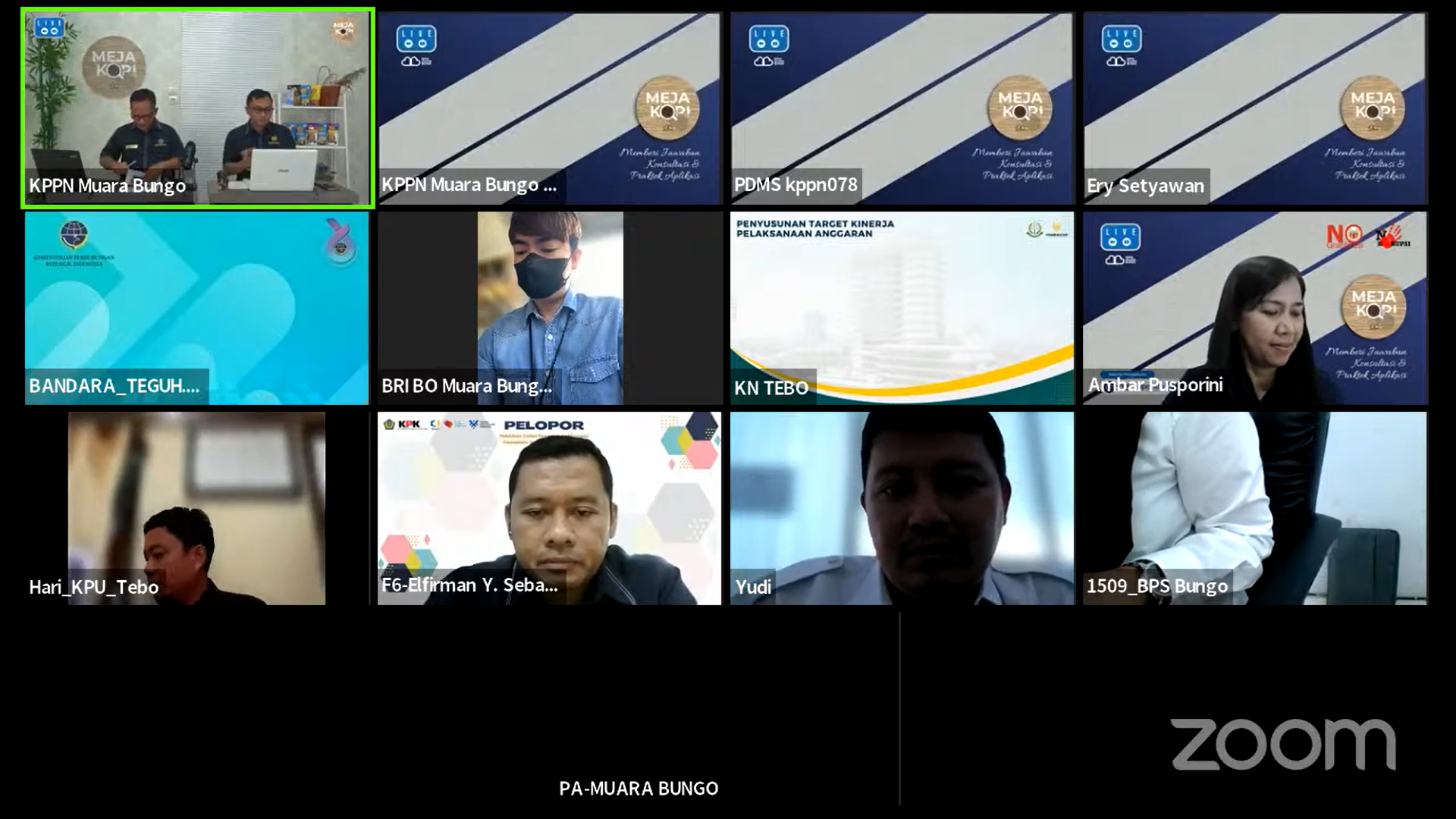 Kegiatan FGD MEJAKOPI 22 dilaksanakan secara daring via aplikasi Zoom dan Youtube pada hari Rabu, tanggal 24 Juli 2024. Kegiatan diikuti oleh seluruh Satuan Kerja KPPN Muara. Kegiatan FGD MEJAKOPI Edisi 22 adalah adalah menyampaikan informasi kepada Satker lingkup KPPN Muara Bungo terkait dengan Evaluasi Pelaksanaan Anggaran Semester I 2024, Penyusunan Laporan Keuangan UAKPA Semester I 2024, dan pemberian penghargaan kepada satuan kerja berkinerja terbaik semester I tahun anggaran 2024. Tujuannya adalah agar Satker memahami Penyusunan Laporan Keuangan UAKPA Semester I 2024, pelaksanaan anggaran triwulan III dapat lebih baik untuk memperoleh nilai IKPA yang optimal dan mengapresiasi satuan kerja yang berkinerja terbaik pada semester I Tahun Anggaran 2024.